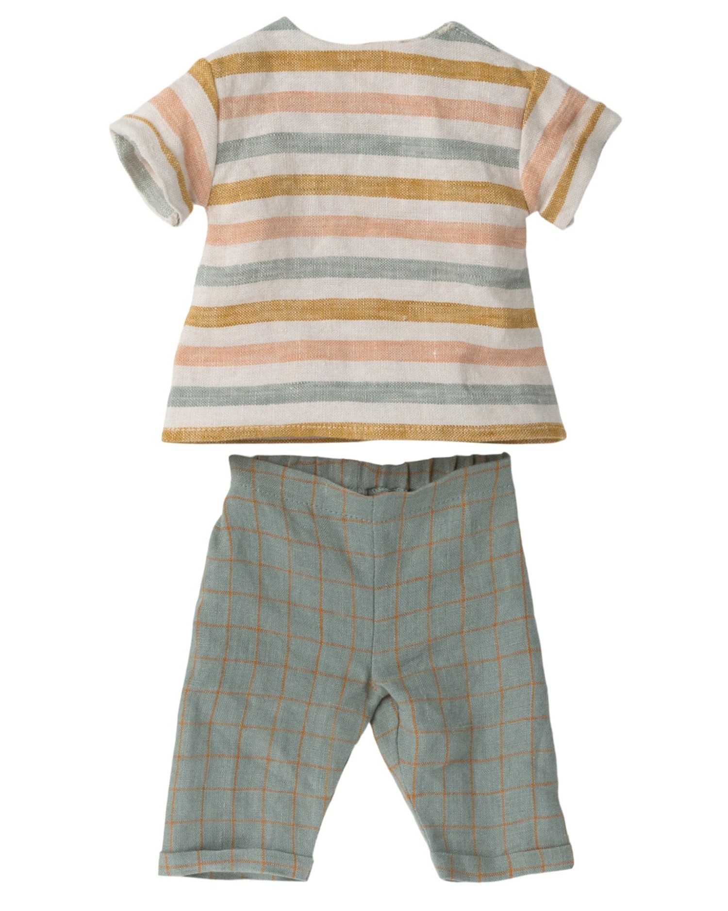 Maileg’s bunny and rabbit collection is made from soft natural linen and cotton fabrics which gives these stuffed friends a lovely hand feel and look. This rabbit is dressed in pants and a striped shirt.