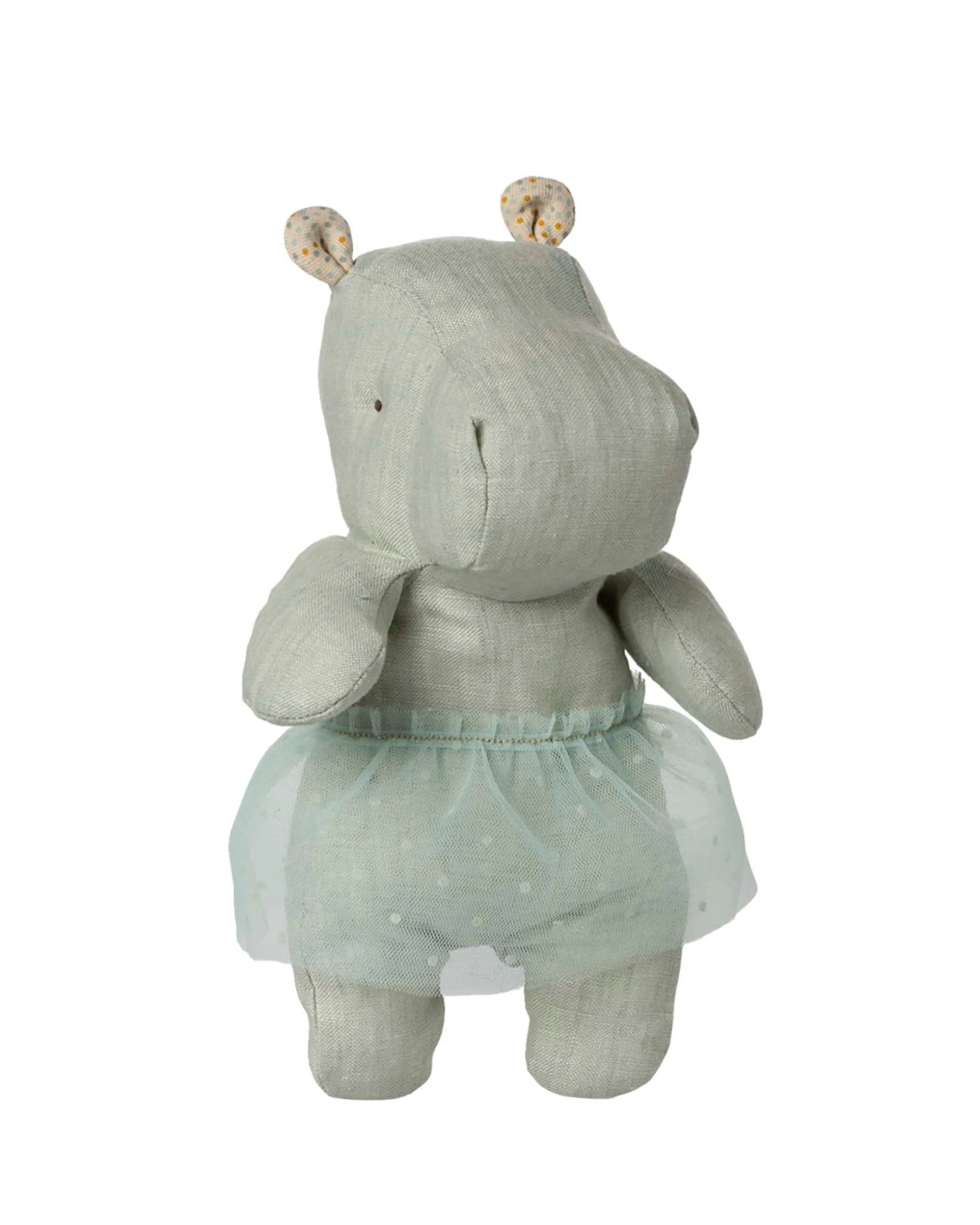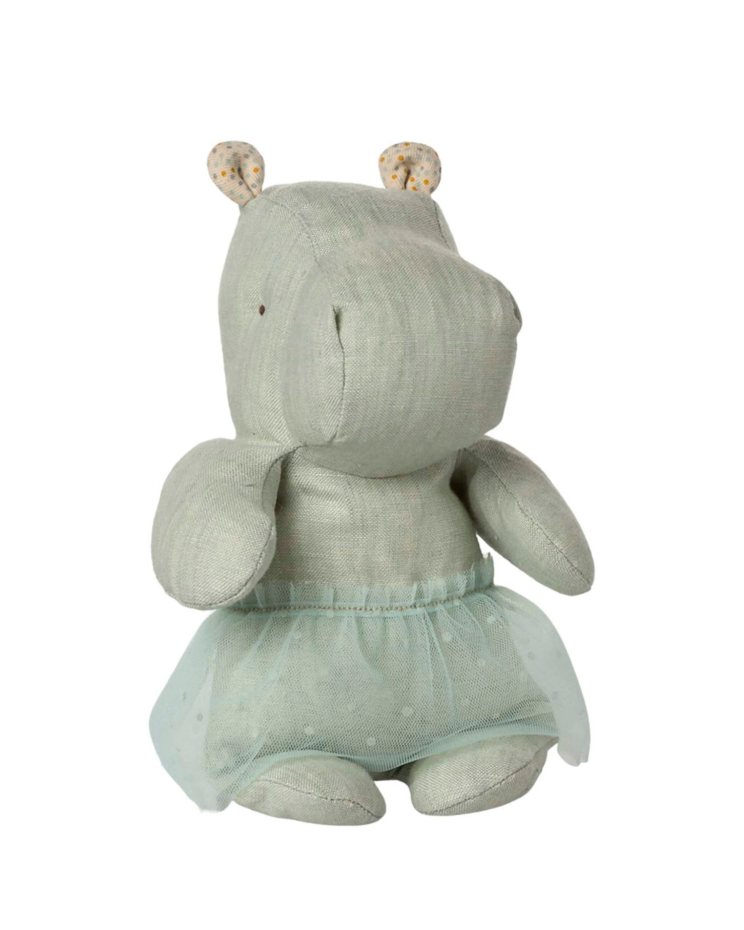 Safari friends are made in the softest fabric and come in great colors. They can sit by themselves as they have beans in their bottom. They are just waiting for you to come and hug them. This small hippo is wearing a beautiful ballerina skirt.