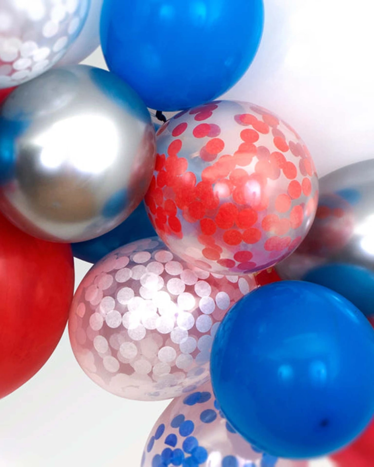 Looking for an impressive party decoration for your 4th July celebrations? This fabulous balloon garland features two sizes of balloons in shades of red, blue, white and silver.
