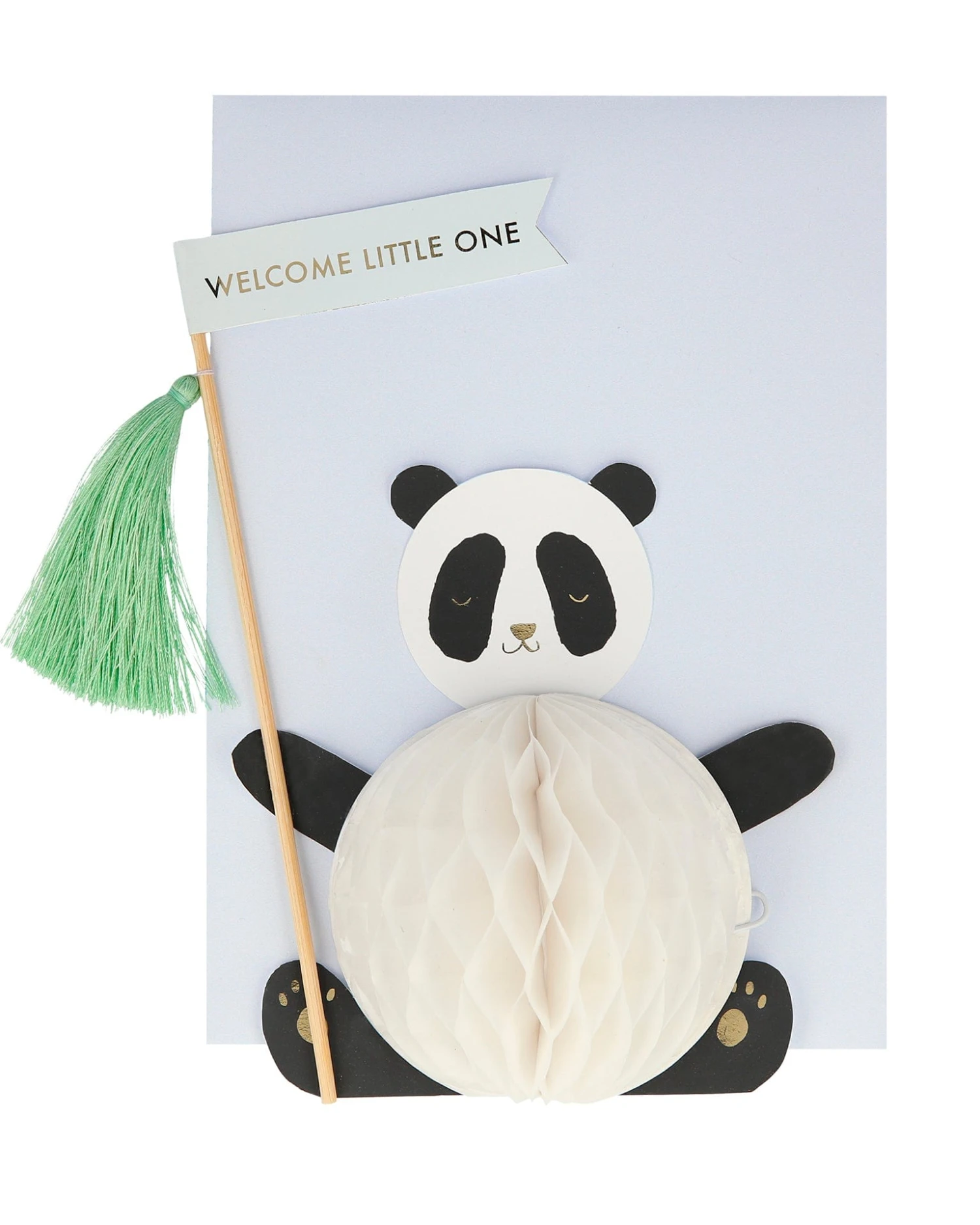 Looking for a special card to send to celebrate the arrival of a baby? This gorgeous panda card is perfect! Featuring an adorable panda, with a big honeycomb tummy, holding a tasseled flag with a sign which says, “Welcome Little One”.