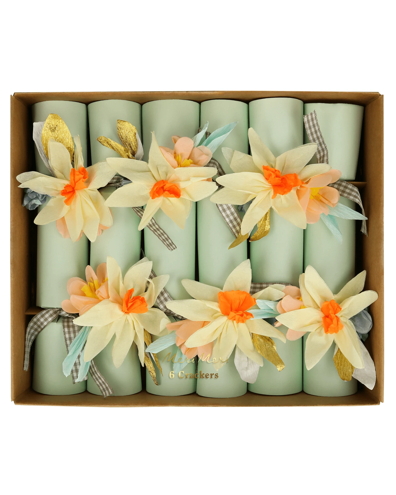 Make your crackers the focal point of your celebration with these beautiful crepe paper daffodil designs. The on-trend gingham ribbon details add extra style-factor, and the glitter fabric brooches hidden inside make wonderful gifts. Great for Easter or Springtime table decor.