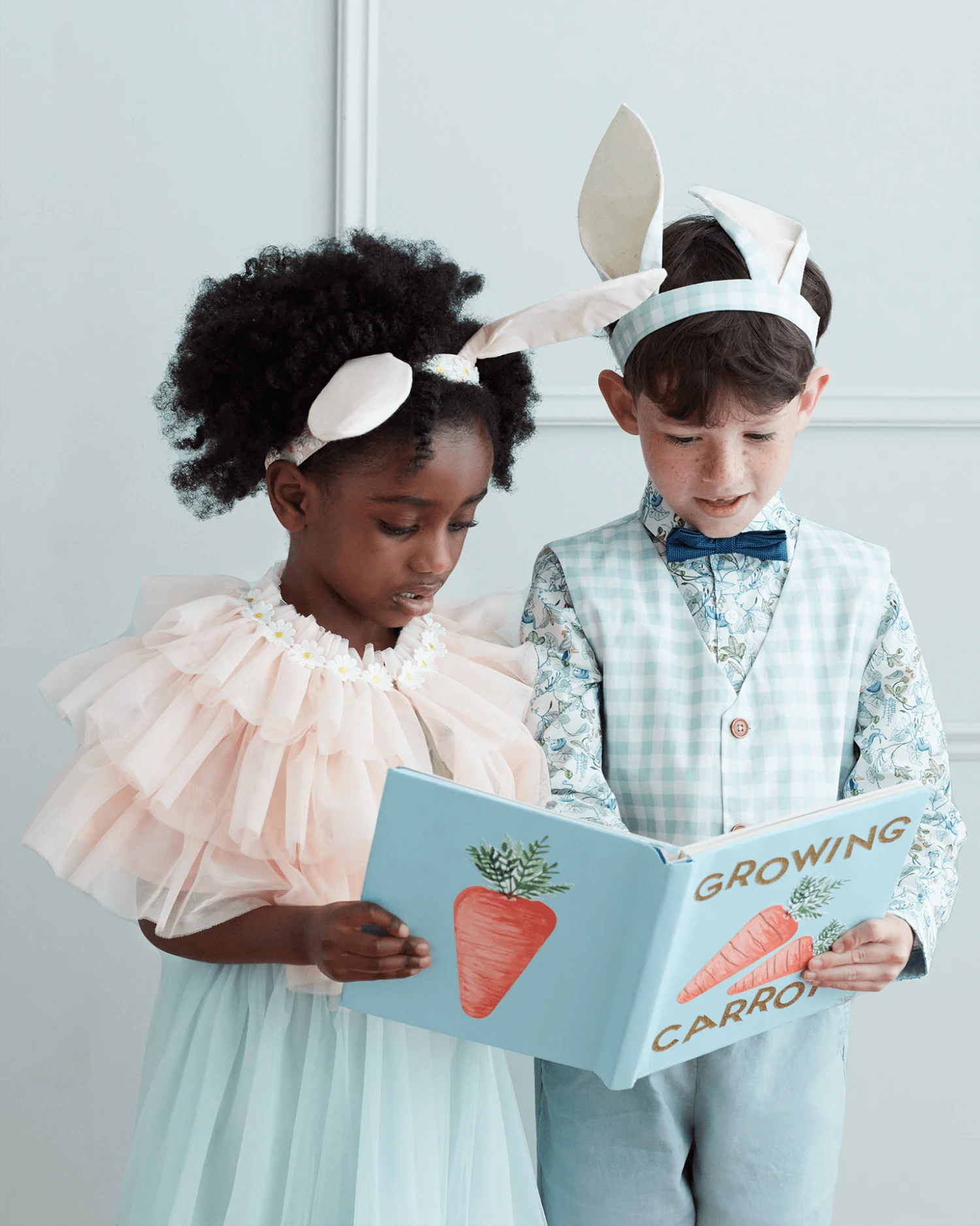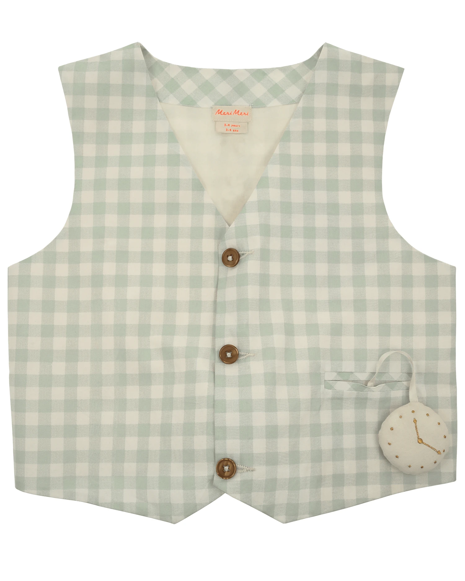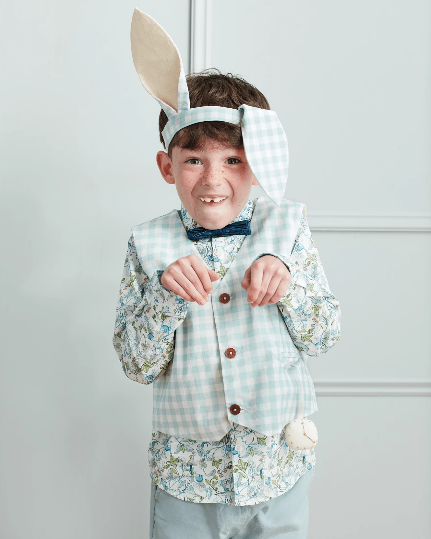 This fabulous bunny costume from Meri Meri is beautifully crafted from blue gingham. Perfect for Easter parties or year-round dress-up fun, this set includes both a headband and a vest. Luxury details include a padded and embroidered fabric pocket watch and a fluffy pompom tail.