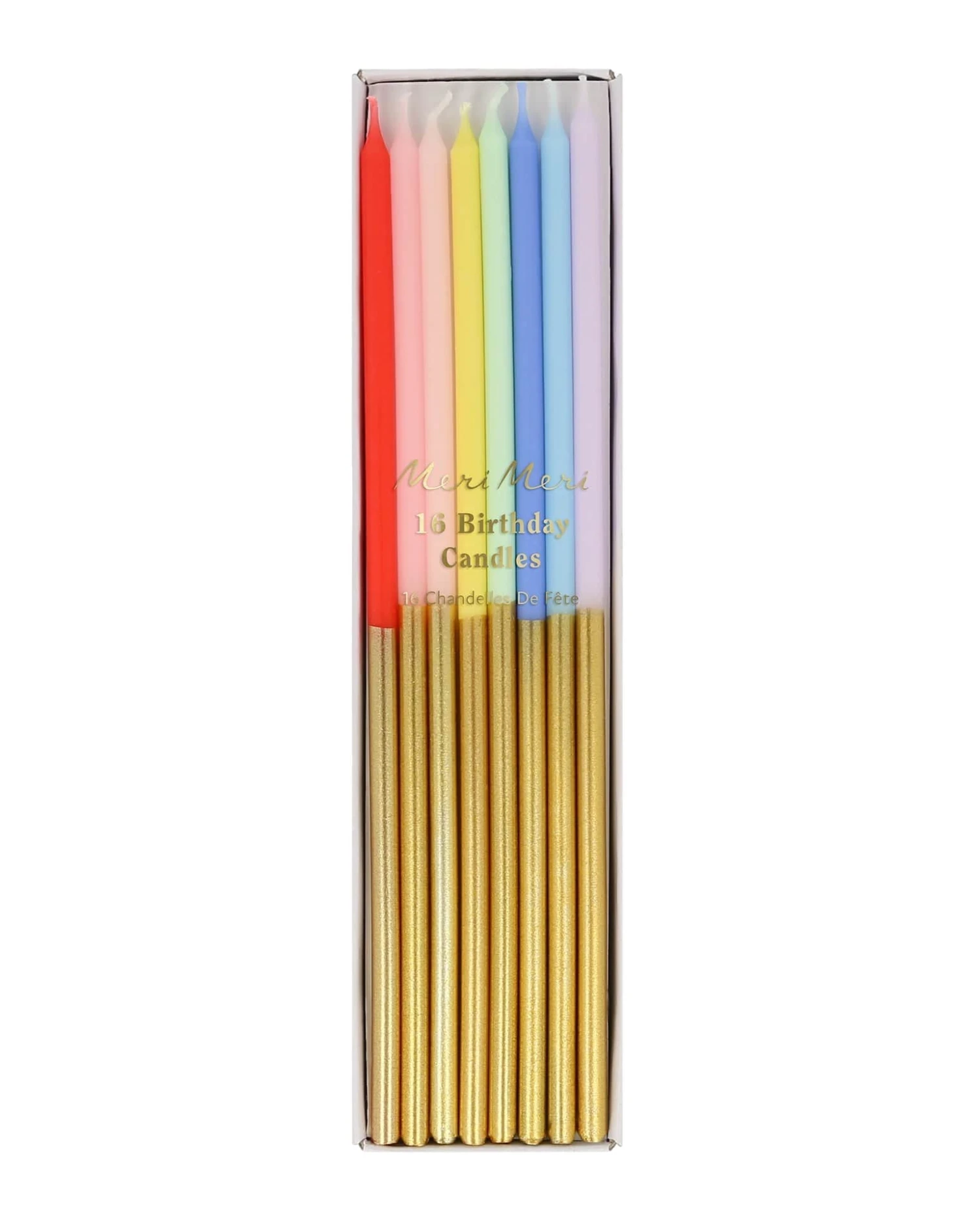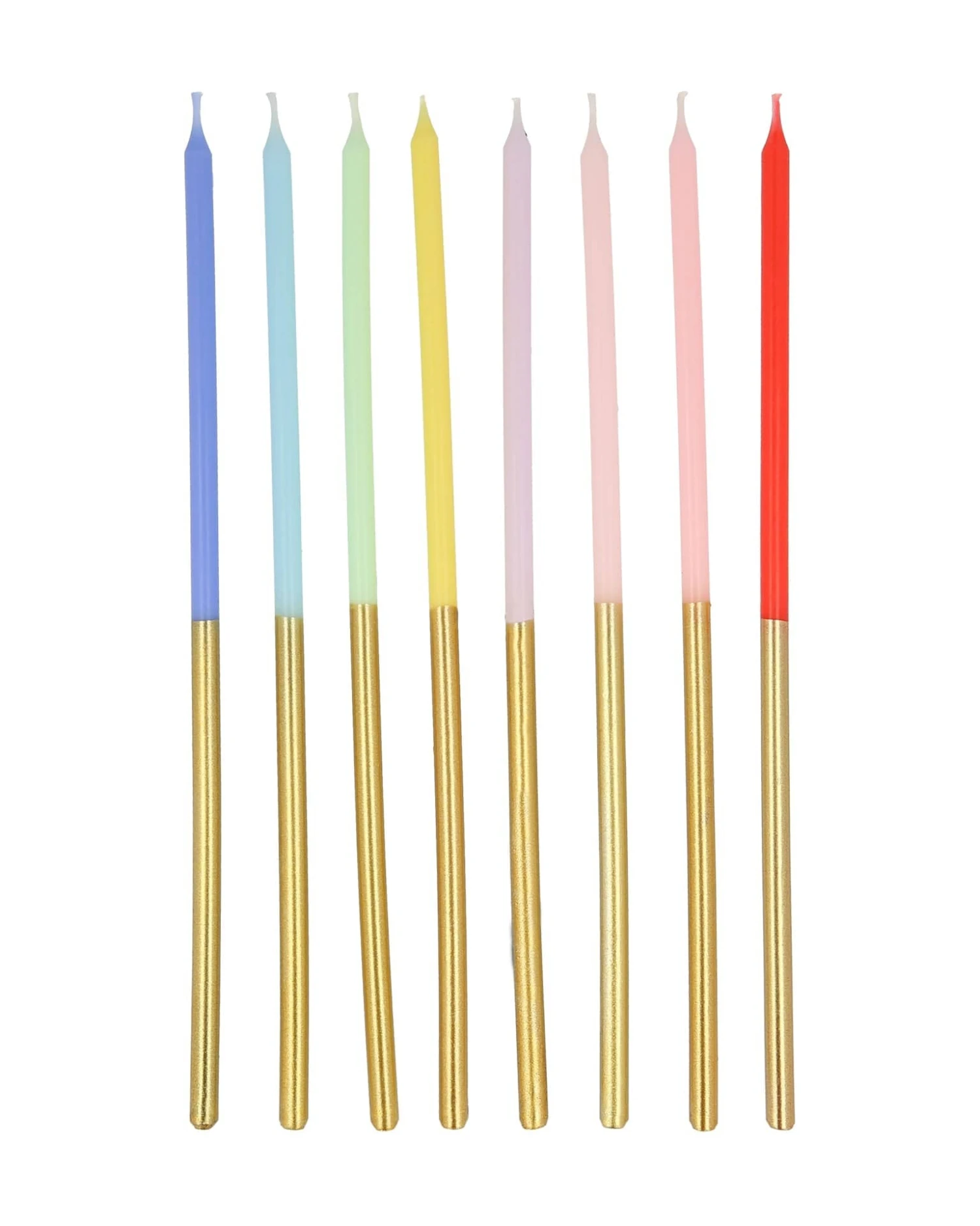 These long candles from Meri Meri, with their mix of bright shades and shiny gold, will give any celebration cake a wonderful pop of color. They’re perfect for birthdays, romantic occasions, baby showers or whenever you want to light up a special party cake.