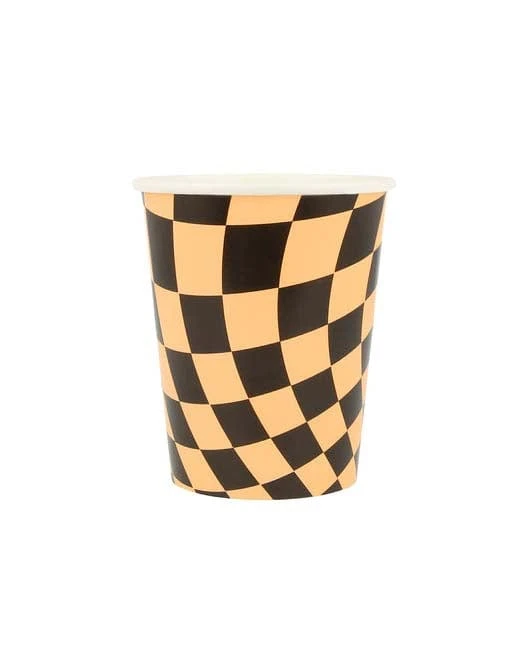 - Each pack contains 3 orange, 3 white and 2 pink cups all with a black checkered pattern