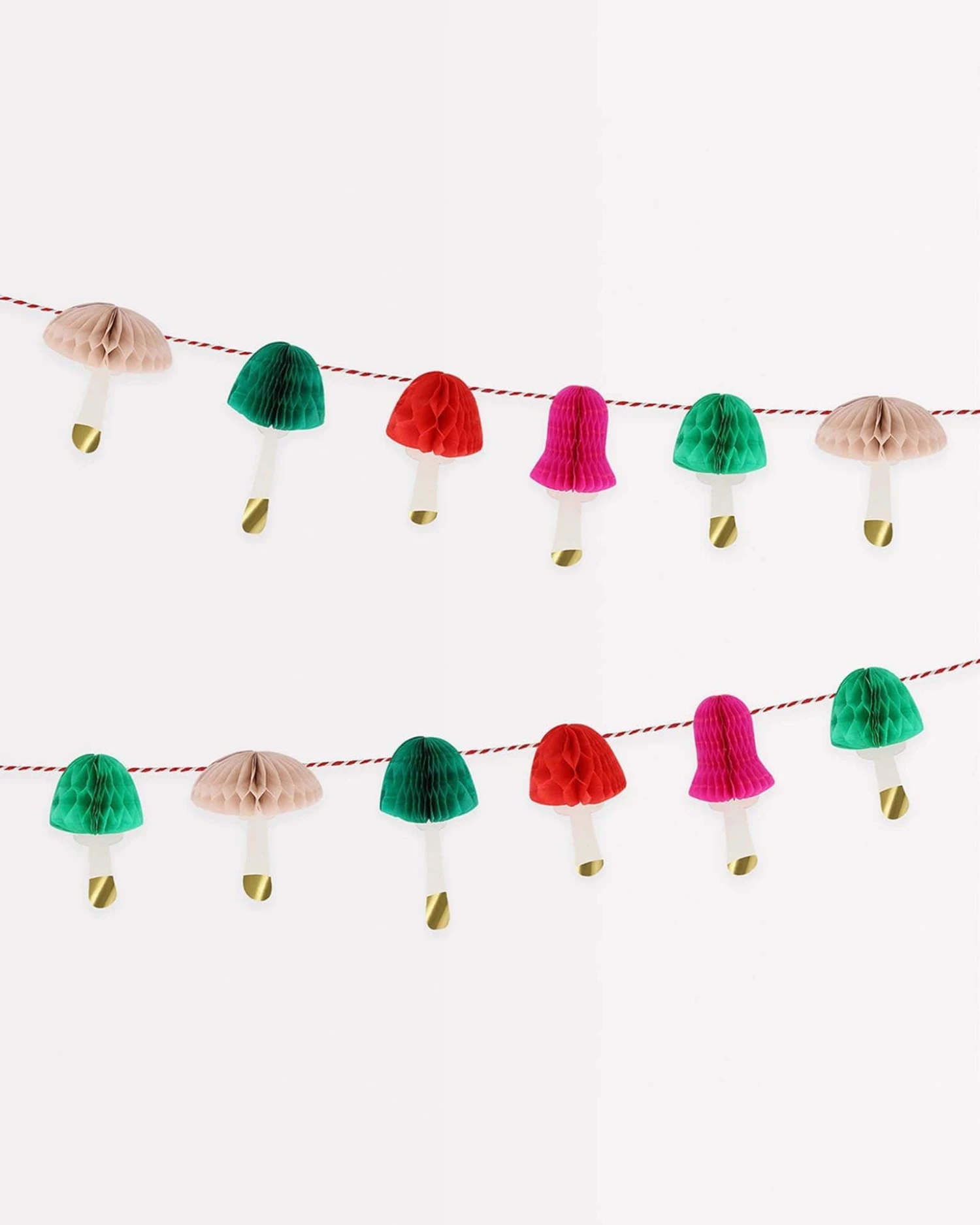 - Tissue paper honeycomb mushrooms in dusty pink, dark green, red, pink and mint