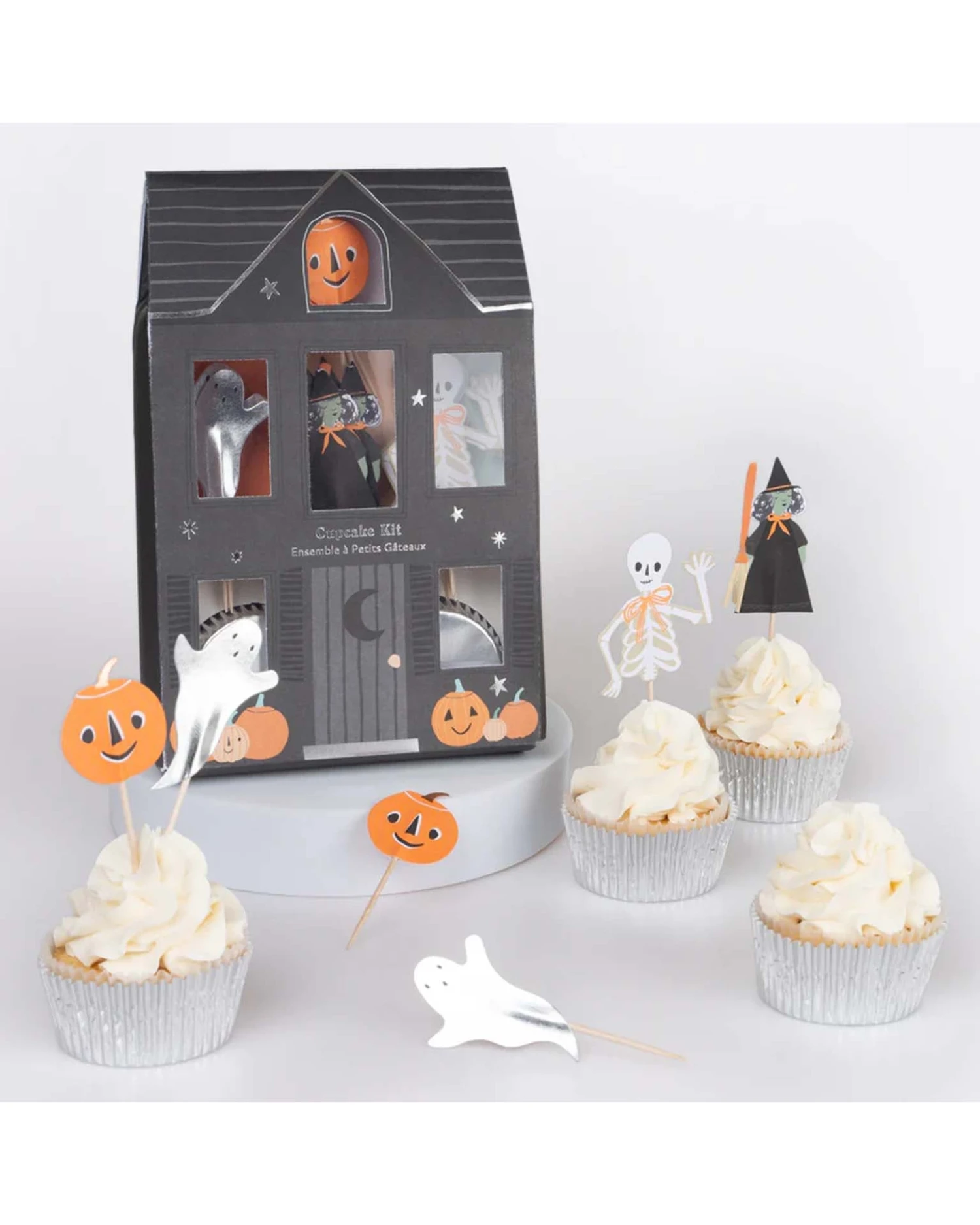 - 24 Toppers – 4 designs with six of each including a friendly witch, happy skeleton and pumpkin, and a ghoulish ghost