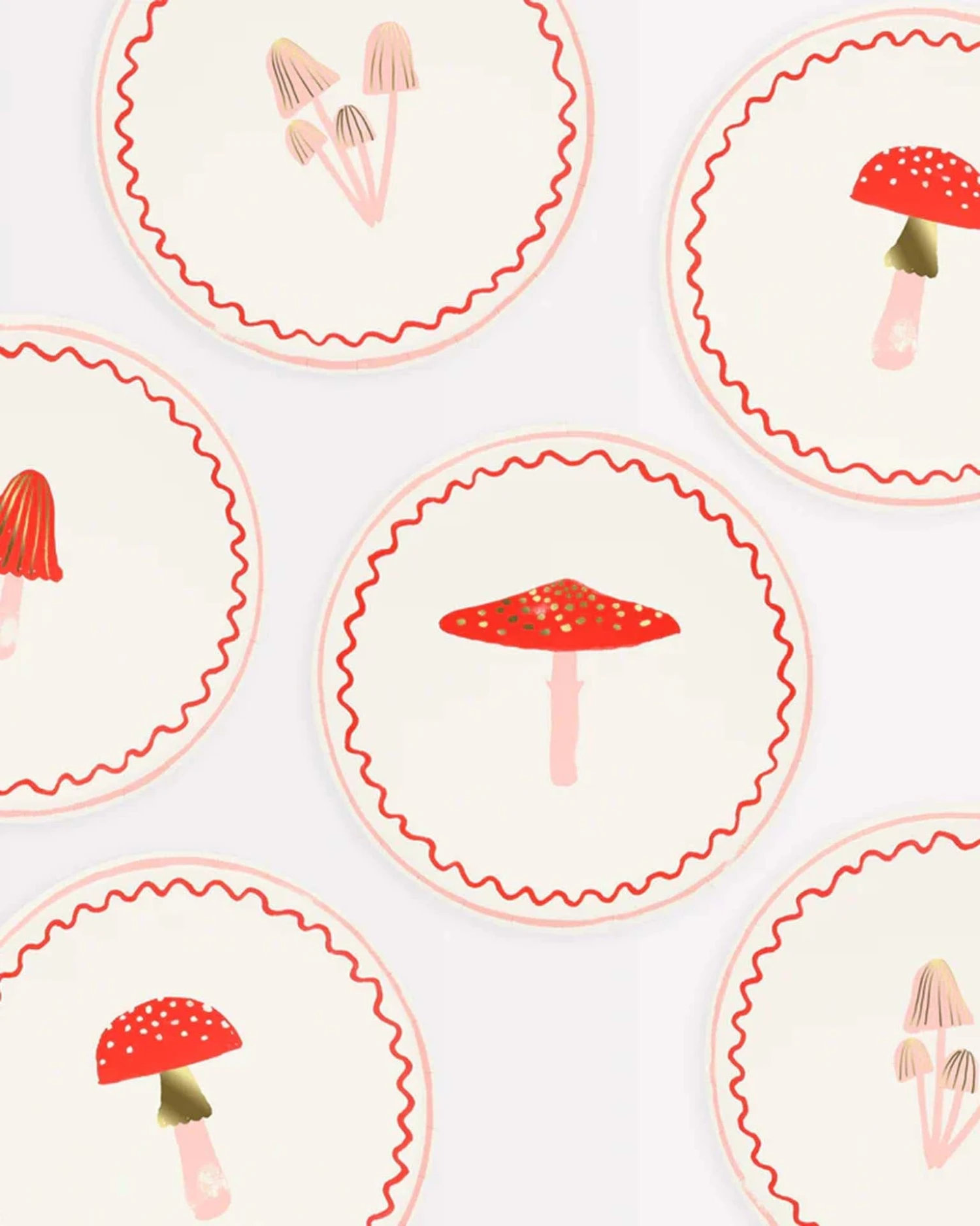 Mushrooms are still having a moment and look magical as a festive plate design. Their red and white fit the traditional festive color theme perfectly, with modern pops of stylish gold foil and pink for extra effect. These small paper plates are ideal for savory or sweet treats, or for a cocktail party.