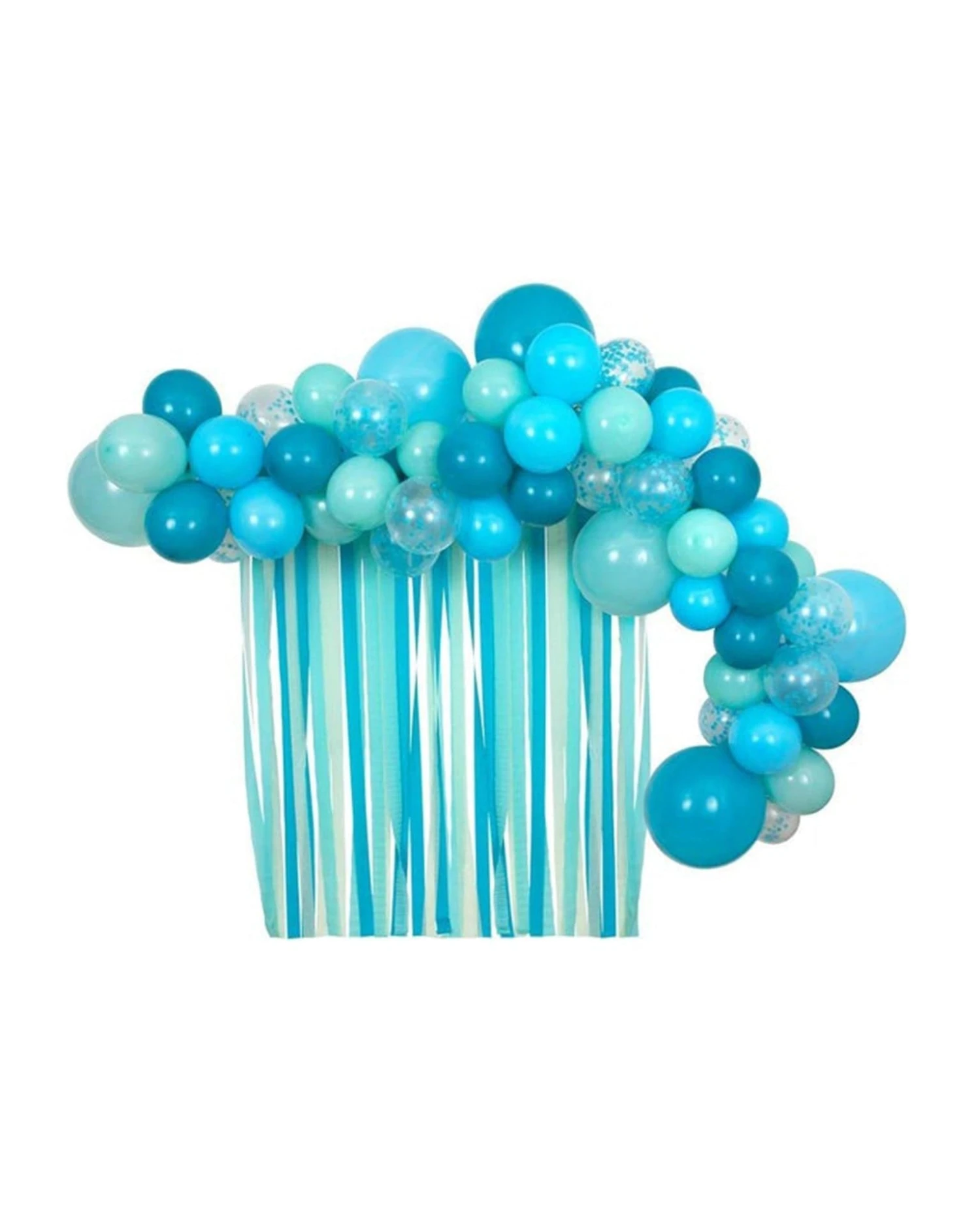 - The 52 balloons include 6 large and 46 smaller, in three shades of blue, and crystal filled with blue confetti