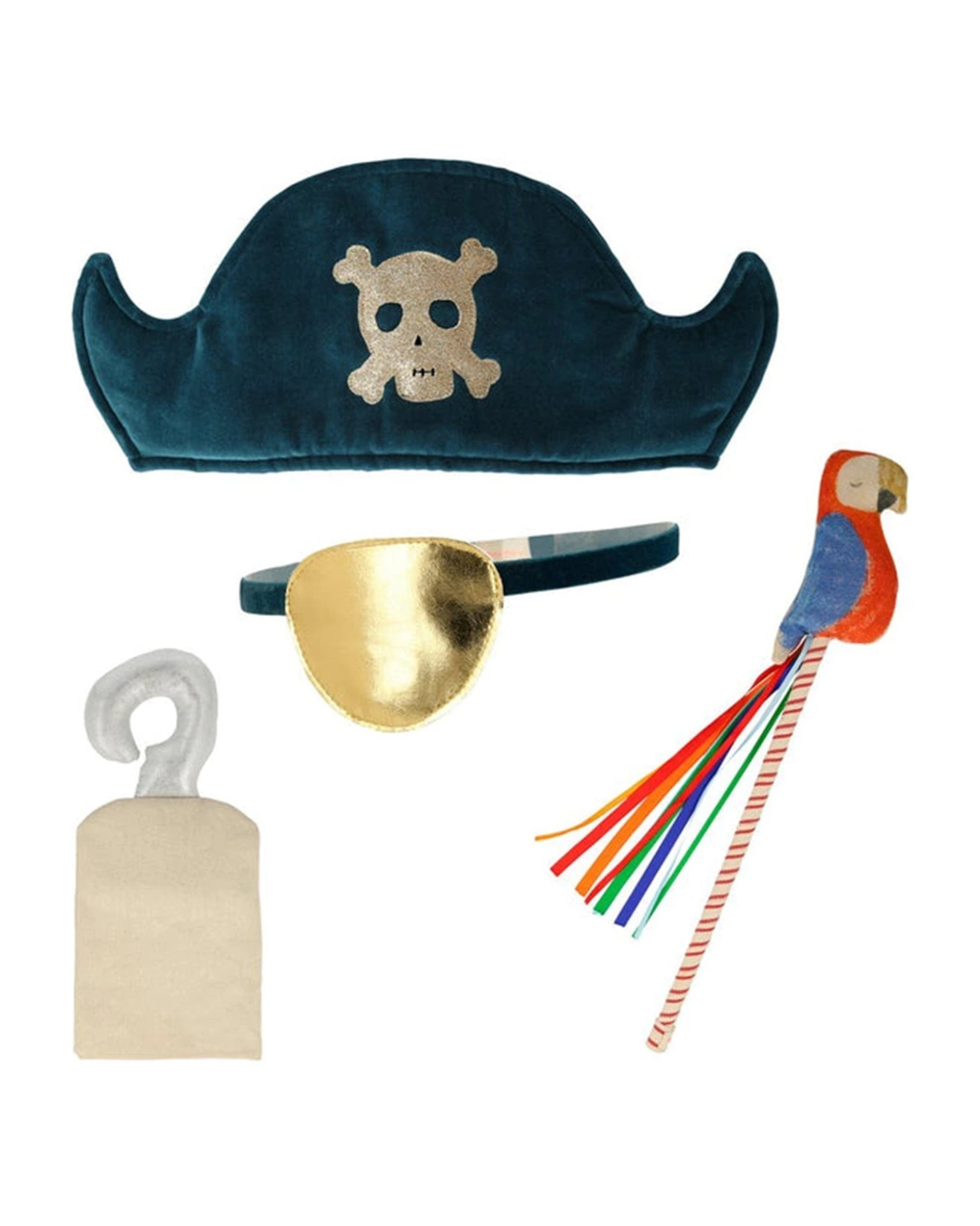 - Includes hook, hat, eye patch and parrot