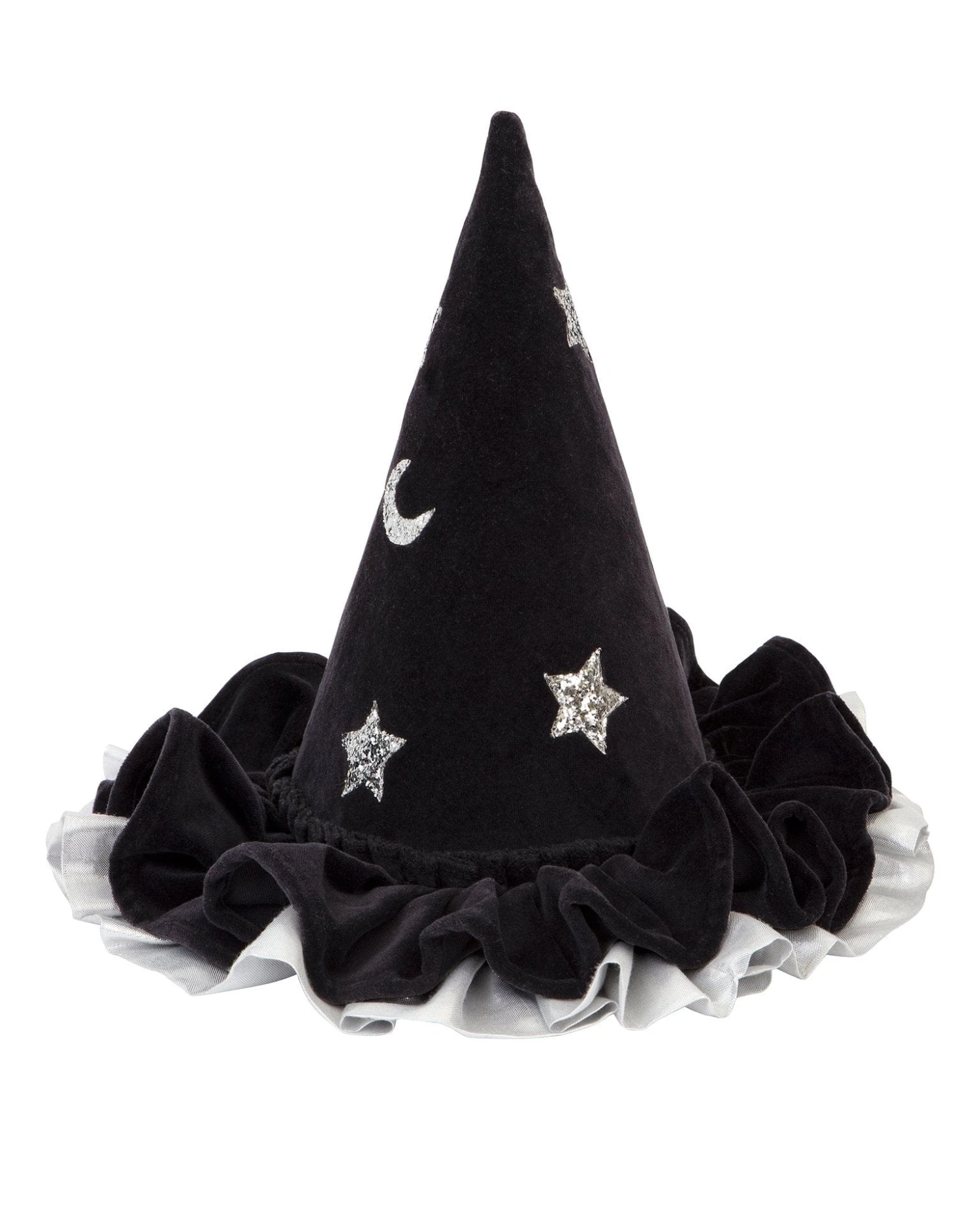 This witch’s hat, with fancy ruffle details, is very stylish indeed. It is crafted from black velvet, with silver lamé and silver glitter stars and moons. An essential accessory for Halloween this year, or a perfect addition to your dress-up box.