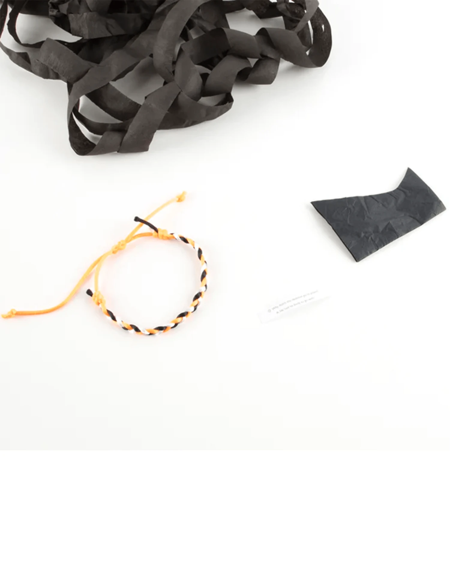 - Each surprise ball contains 2 tattoos, a joke, a black paper hat, and a neon orange, white and black cord friendship bracelet