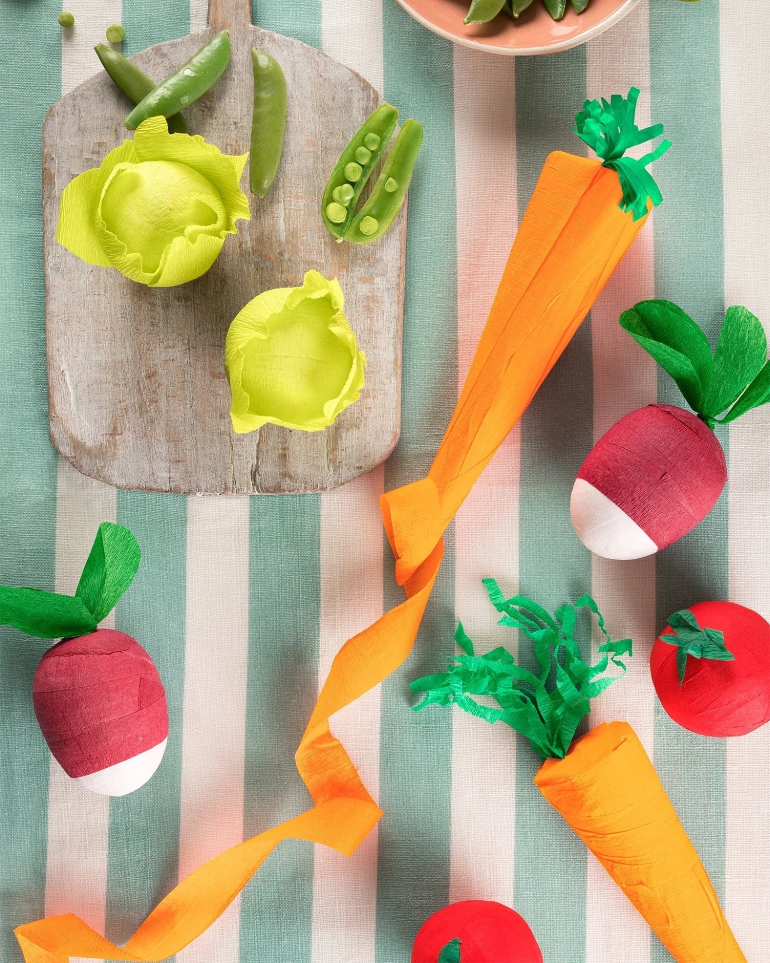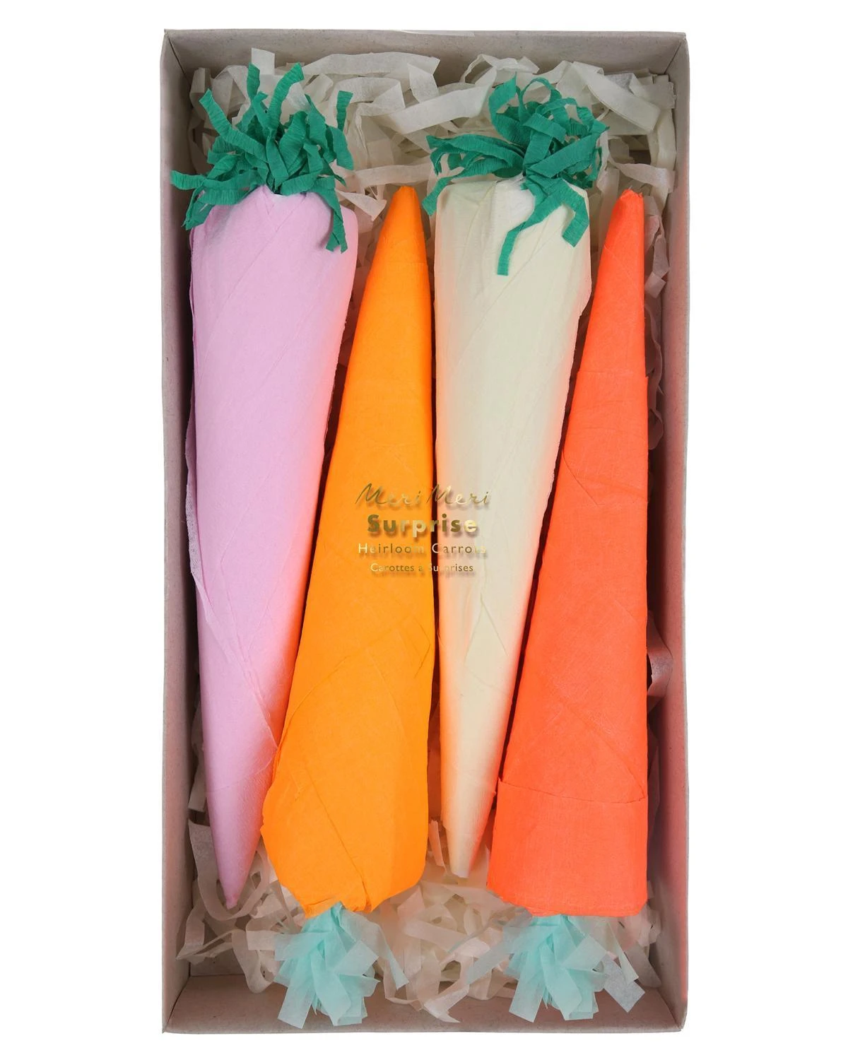 Meri Meri has come up with a brilliant new take on the traditional “surprise ball” – surprise heirloom carrots! Designed to look just like the ones in the supermarket, each pack contains four carrots in four colors, each luxuriously wrapped in crepe paper, hiding a fluffy yellow chick, two temporary tattoos and a joke.