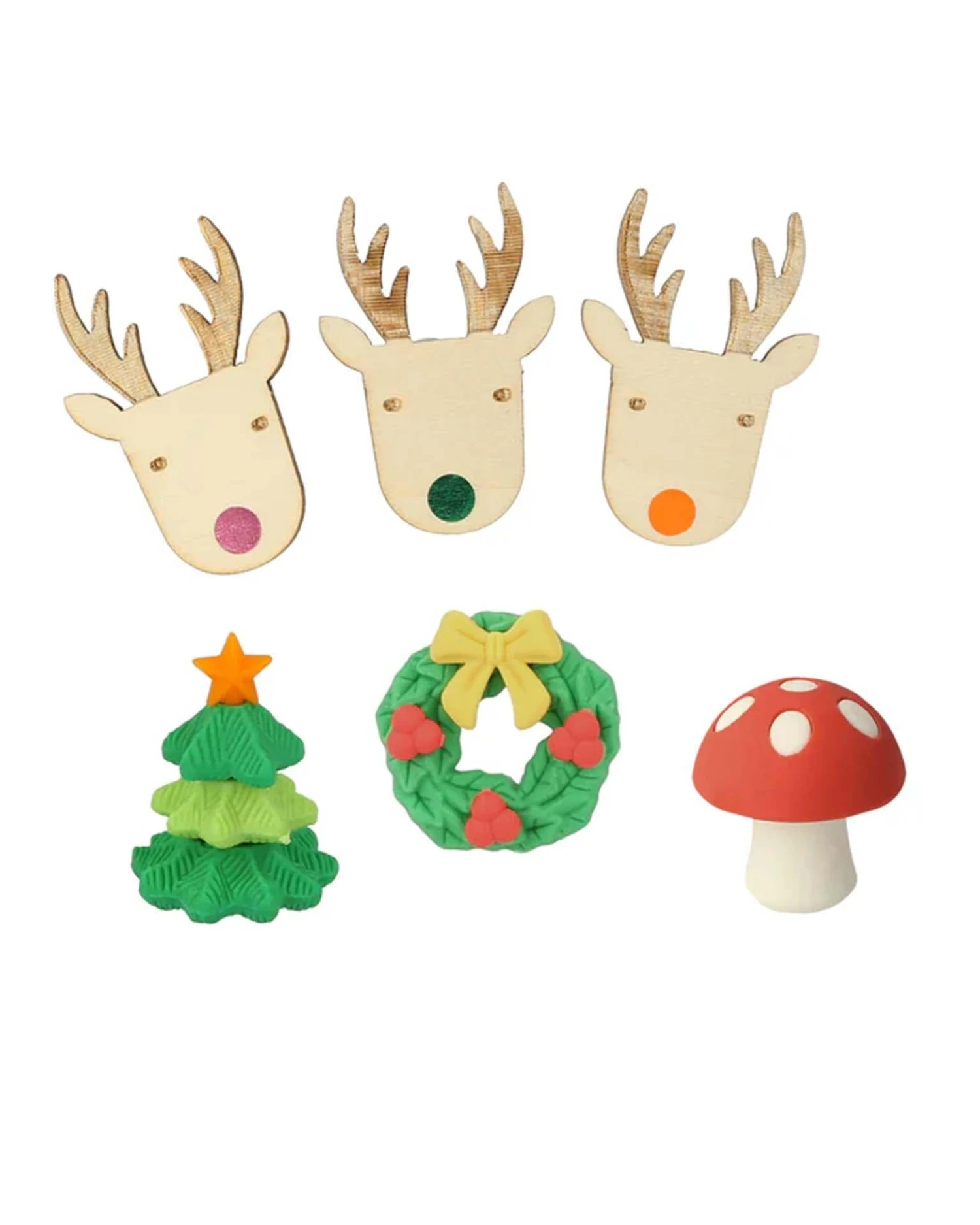 - The festive erasers are shaped like a Christmas tree, mushroom or a wreath
