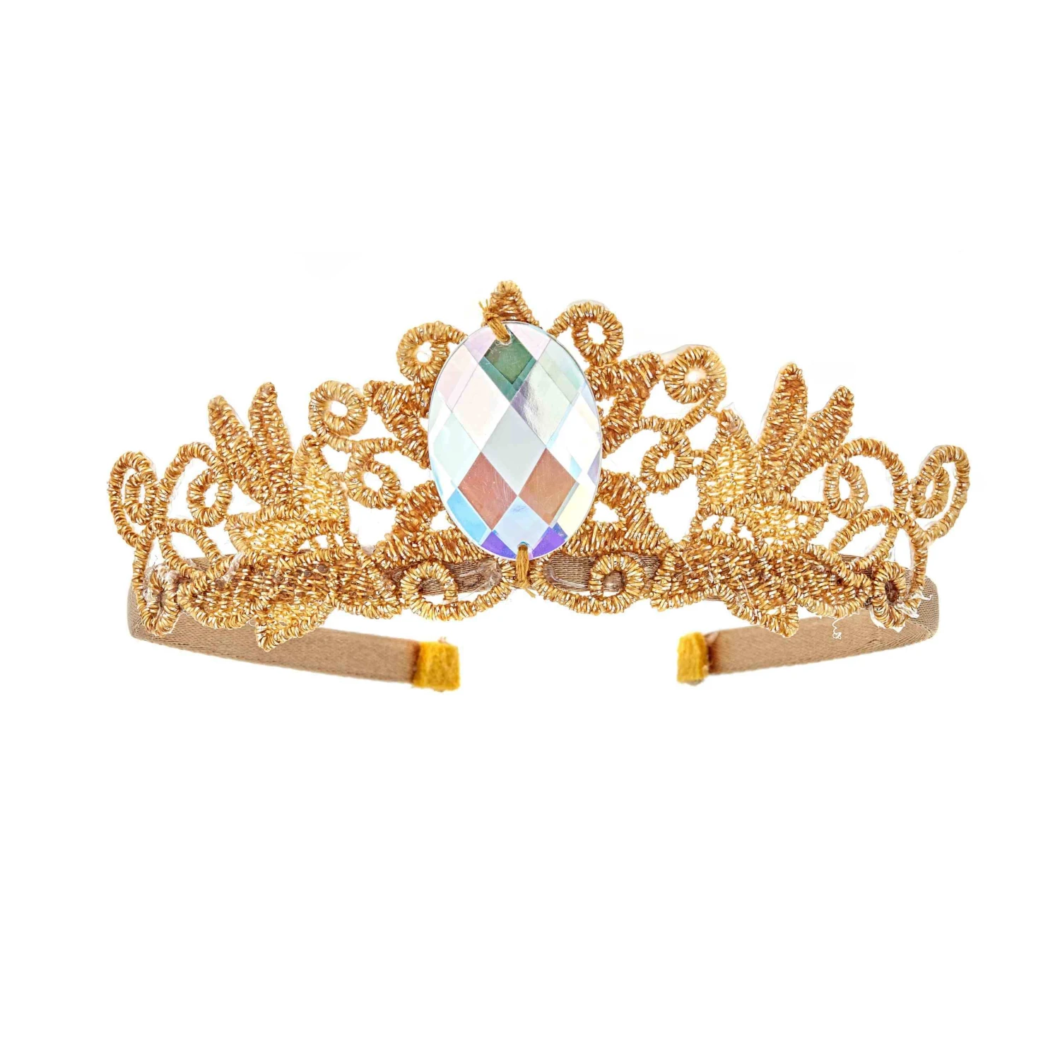 - Color: Gold lace base with a large clear acrylic gem.