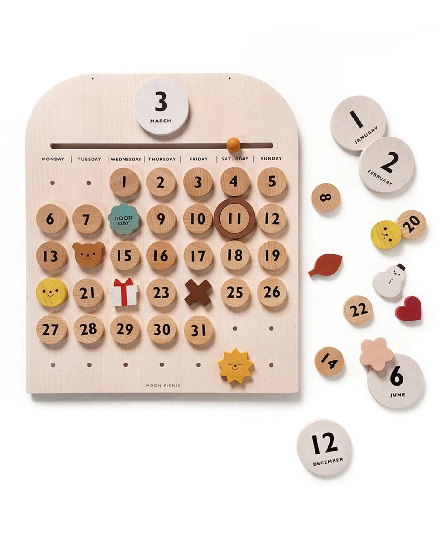 This wooden calendar features a beautiful original design by Moon Picnic and is made from sustainable FSC solid beech wood. It is sure to be a long-lasting family heirloom piece that will be used daily.