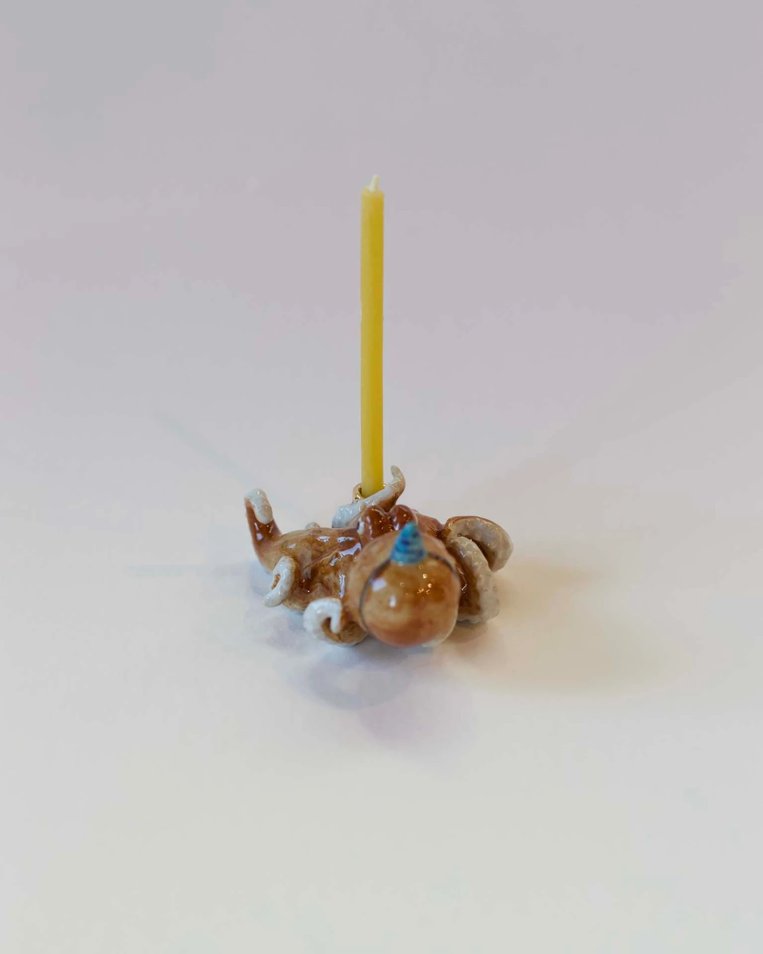 Celebrate with a little whimsy with this ceramic Octopus Cake Topper from Camp Hollow. This hand-painted candle holder is the perfect accessory for that sweet special occasion. With heirloom-quality craftsmanship, this mushroom is sure to be a treasured family keepsake. Party on!
