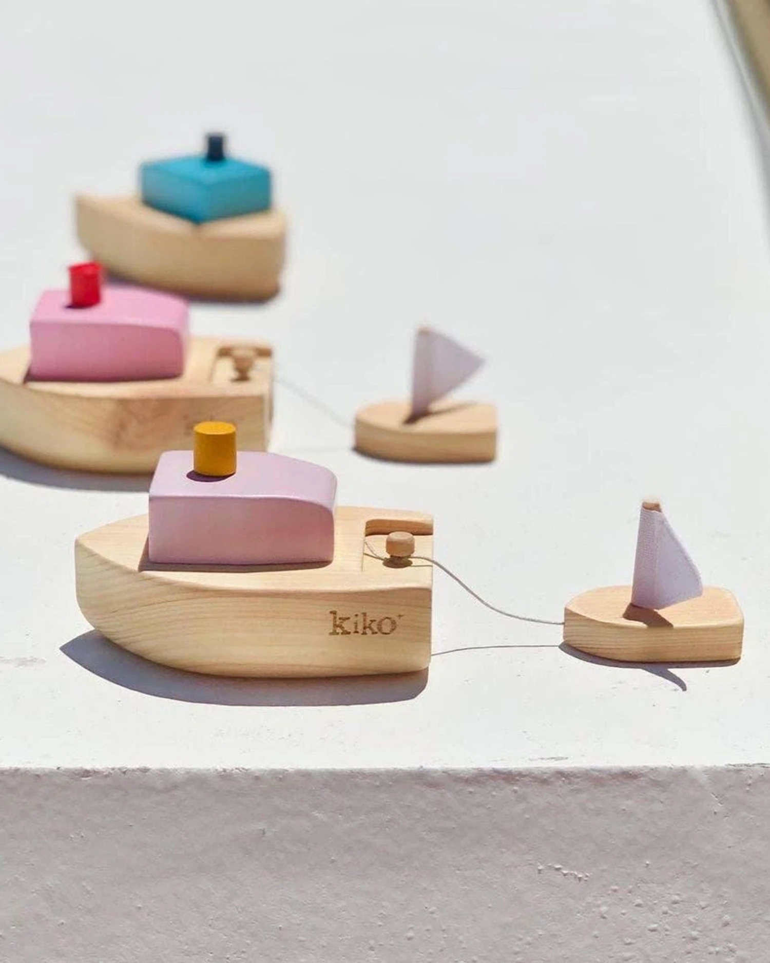 Hinoki is an ancient cypress wood native to Japan. Light-weight, antimicrobial and naturally resistant to humidity, it’s been used for centuries in Japanese bathhouses- which makes it the perfect material for a bath toy too. To set your “ofune” to sail – first, wind the rotating knob on the top of the boat. Then, place in the bath or small pool and watch the Mama boat tug the baby boat around and around in circles!