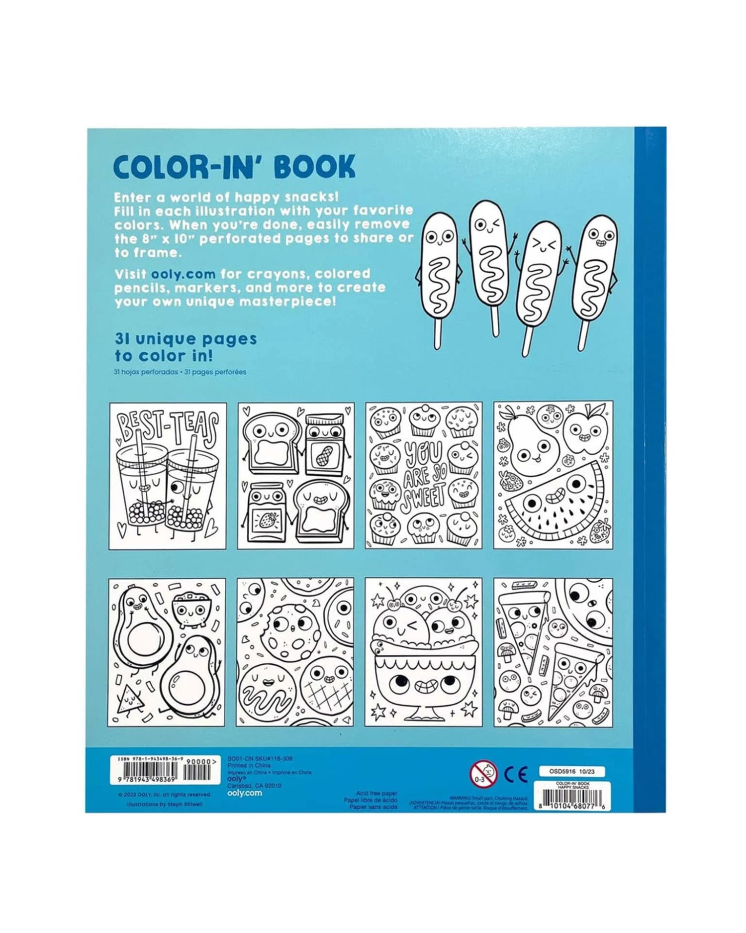 - Coloring book includes funny illustrations of happy snacks including pizza, ice cream, cupcakes, and more