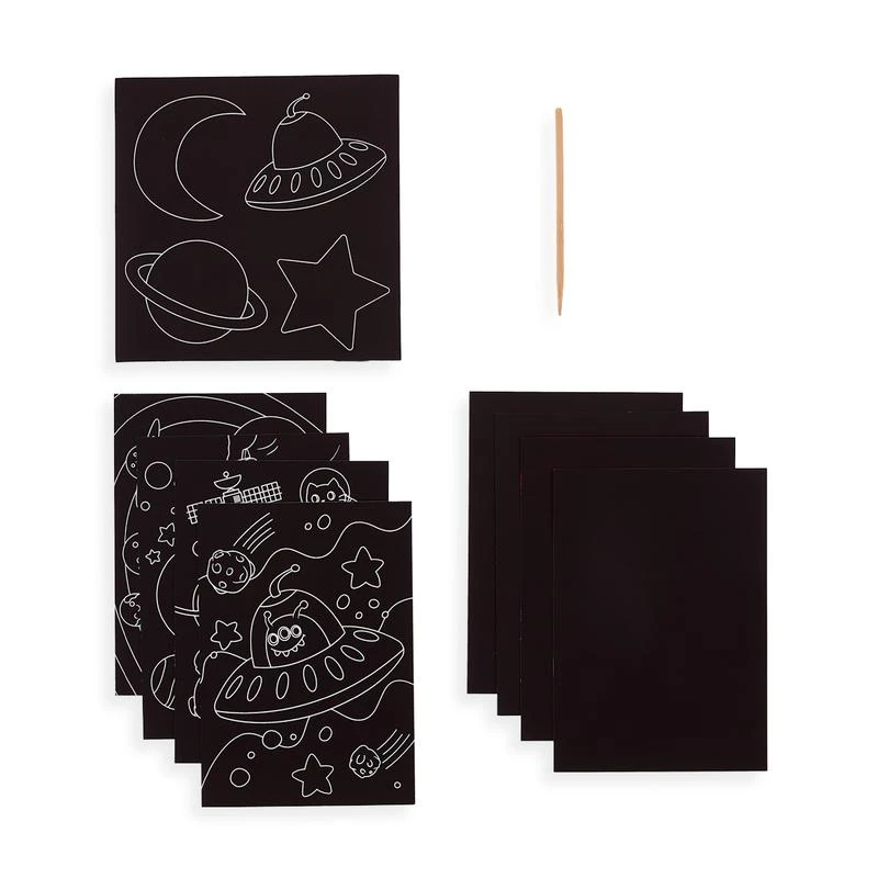 Scratch away to reveal astronauts, Astro dogs, and cats in Space Explorers Scratch Art Kit with easy-to-follow guidelines. It’s a snap to create incredible works of art with the 4 guided illustrations that are super easy for kids to follow. Or use your imagination to scratch your own designs onto the 2 rainbow cards or the 2 sparkle cards; the rainbow and sparkle are hidden until you scratch in your design. And once you’re done scratching the fun doesn’t end there. You can frame the cards or cut out the designs to create new characters to play with! Plus the sticker sheet can be scratched to reveal more sparkly fun! Each space scratch art kit has everything needed to make beautiful scratch art.