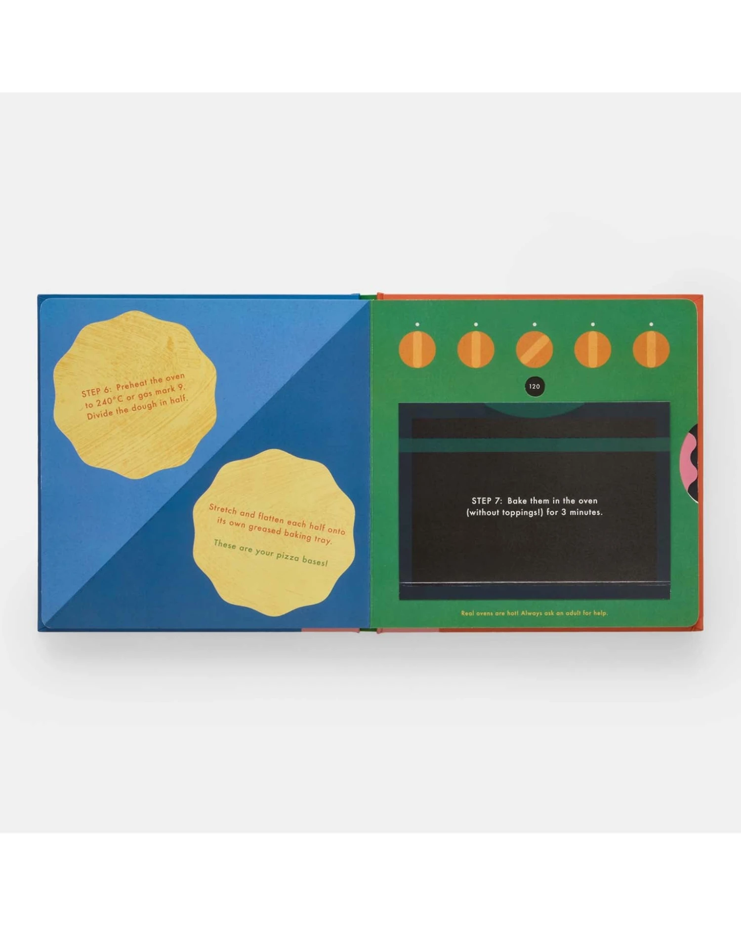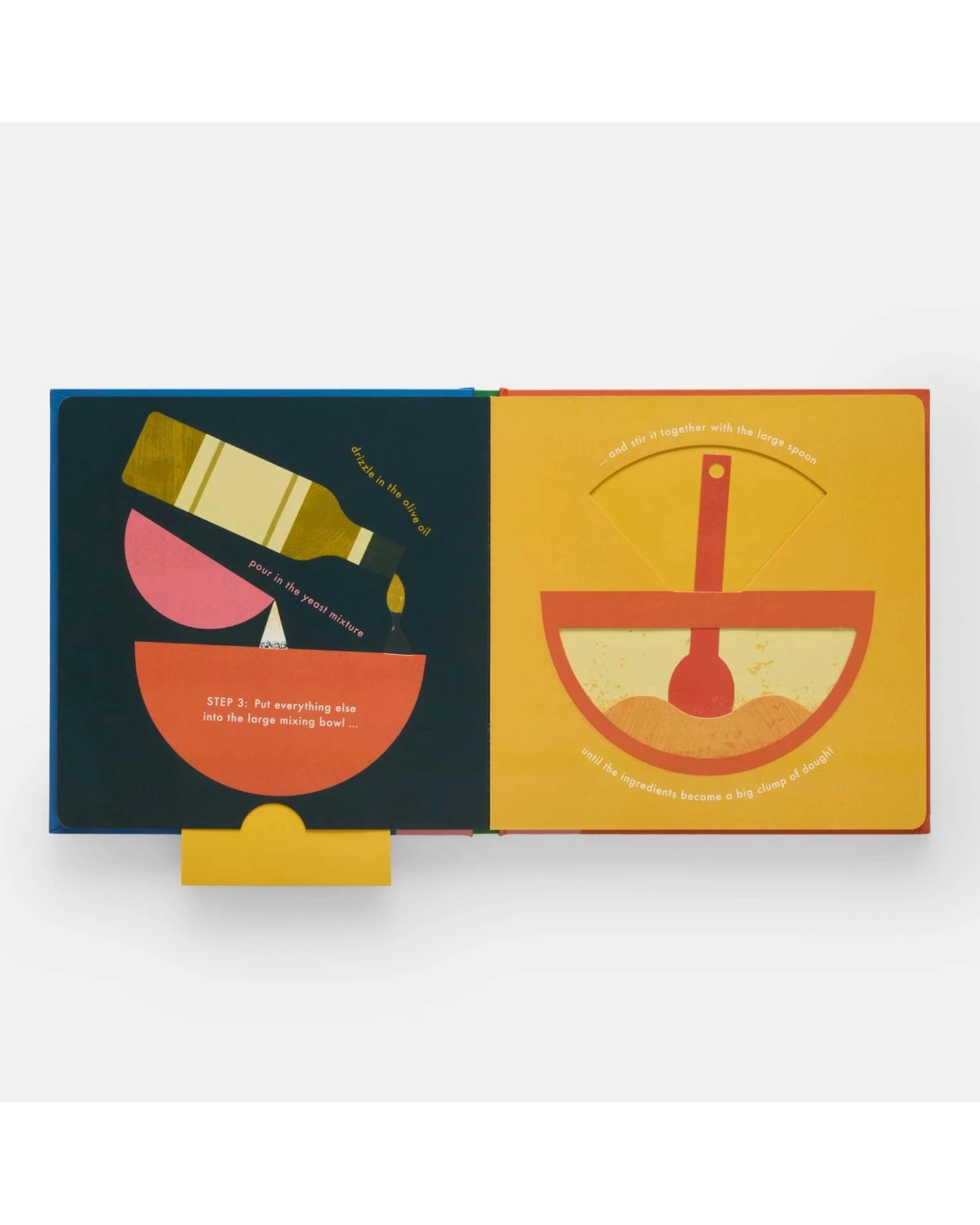 Cook pizza from scratch in this fully interactive recipe book that allows readers mix the ingredients, knead the dough, spread the sauce, and more! STEP ONE: Stir the yeast and sugar into the warm water, and set aside until bubbly. STEP TWO: Combine the flour and salt in a large mixing bowl. STEP THREE: Add the oil and yeast mixture into the large bowl and mix until the ingredients turn into a large clump of dough!