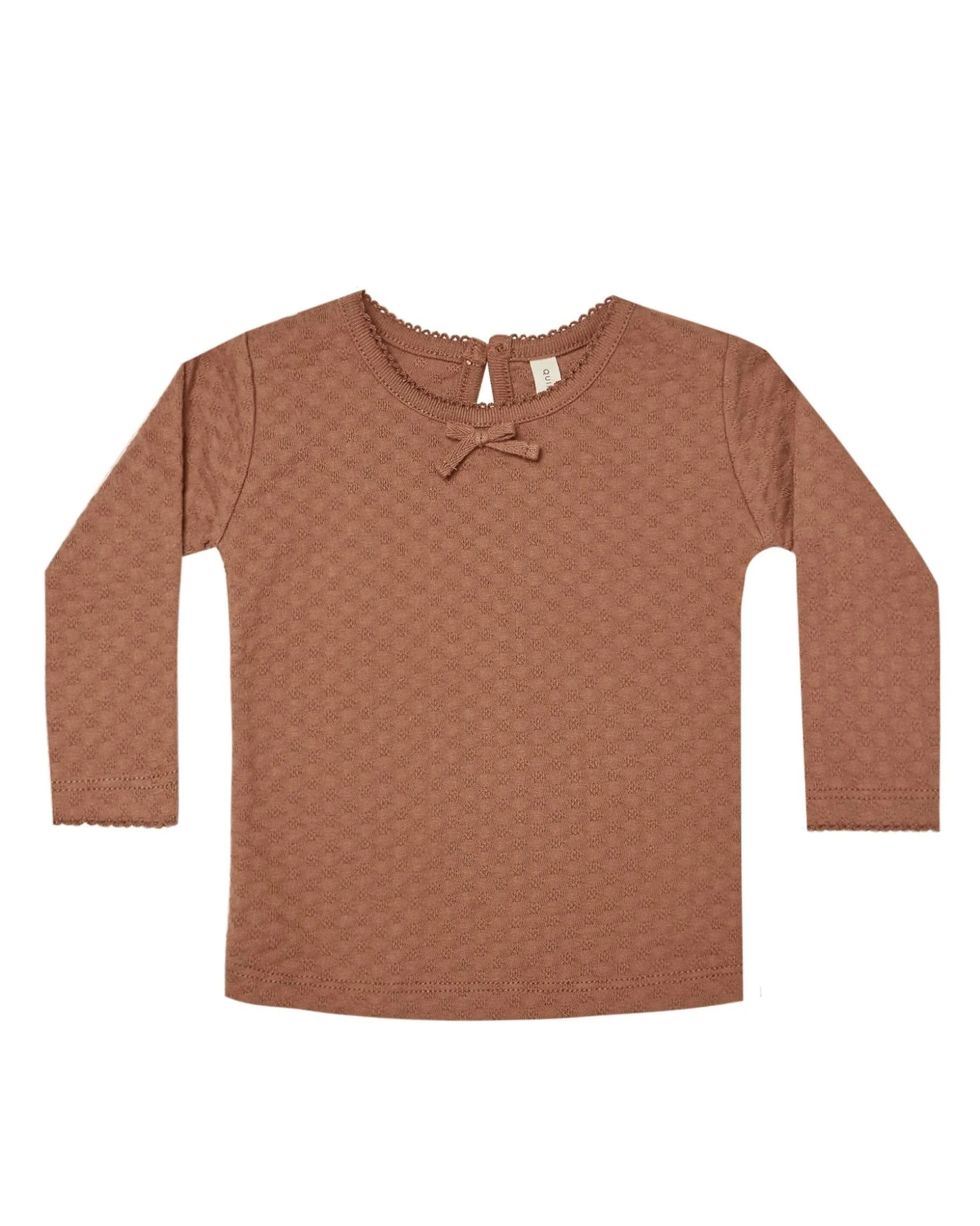 Meet the perfect everyday shirt, the Longsleeve Pointelle Tee. This 100% organic cotton top features delicate fabric detailing and a sweet bow on the collar. Pair this tee with the Pointelle Legging to complete the look.