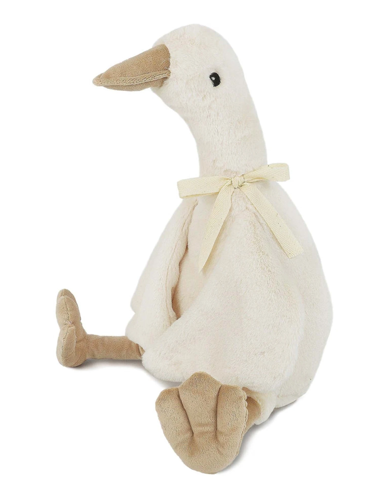 Meet Pru the stuffed goose. Super cuddly in a beautiful cream fur and twill natural tie at her neck. Plopped in the playpen or situated on a shelf in the nursery, this charming hen stuffed animal brings endless smiles and hours of amusement.