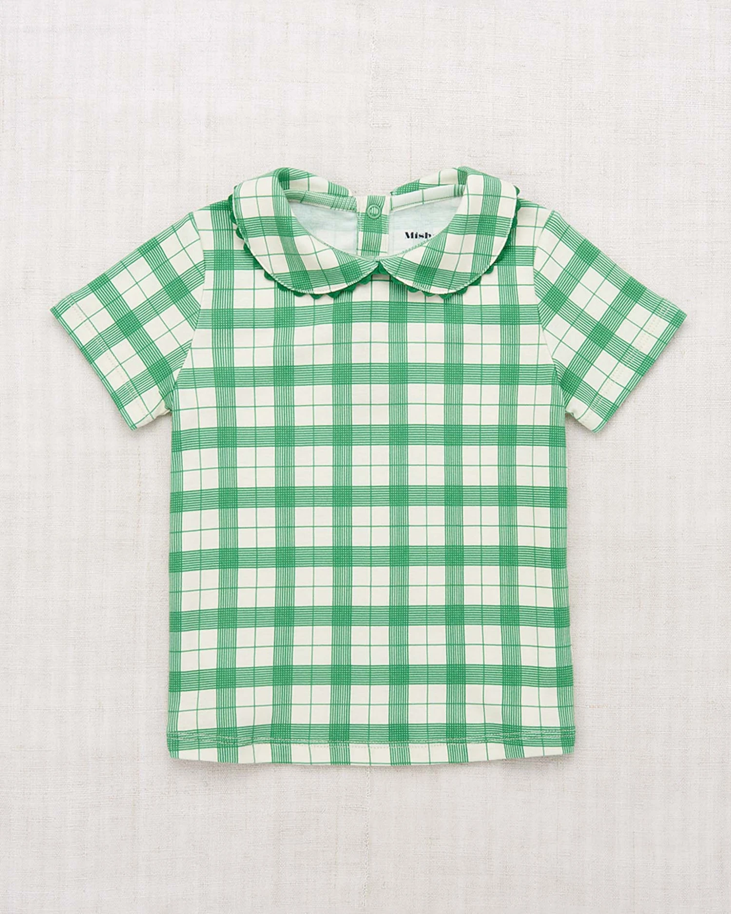 A short-sleeved tee in soft Pima cotton, featuring a gently rounded Peter Pan collar with inset rickrack detailing and snap closure at the back neck.