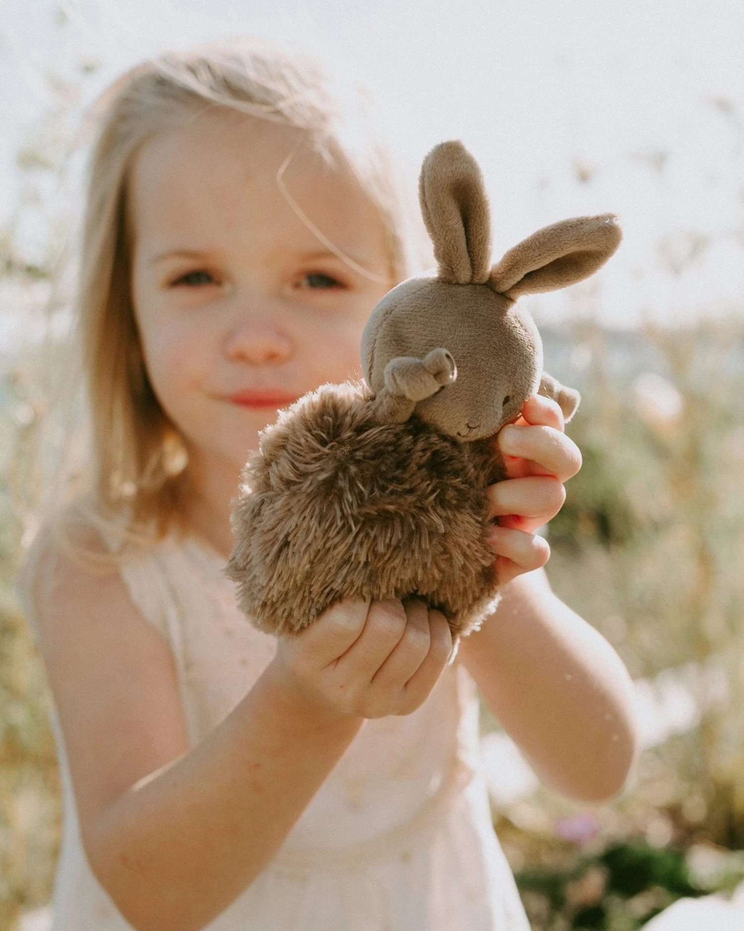 The teeniest new stuffed animals from Bunnies by the Bay happily fit in the tiniest hands. This is a fluffy, round, white-furred stuffed bunny with a velour face and dangly arms and legs. This Roly Poly Brownie is perfect for children of all ages.