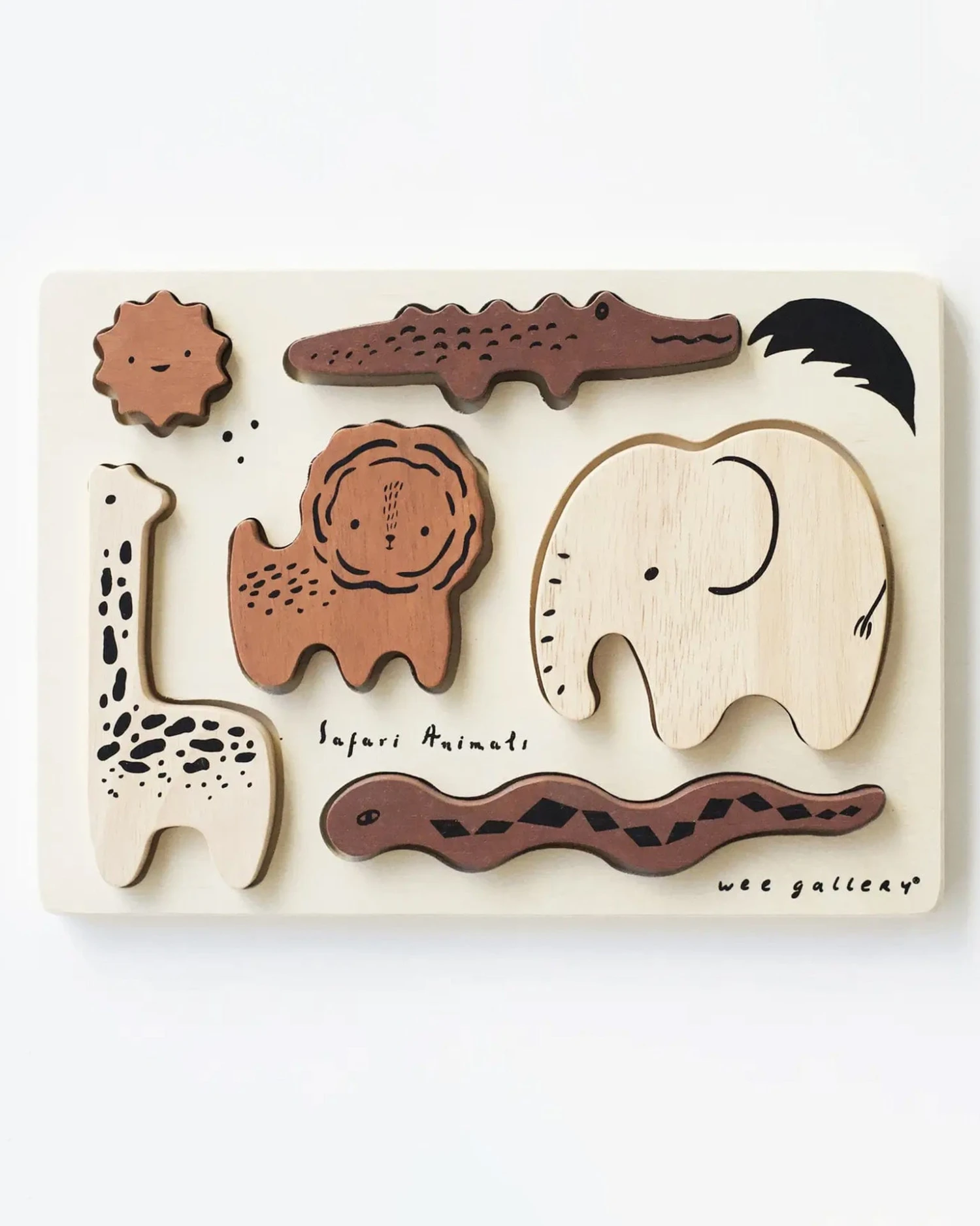 Wee Gallery’s six-piece Wooden Puzzle is perfect for many kinds of play! Solving the tray puzzle is just the beginning, little ones can also use the wooden animals as playtime characters in this themed set. For more educational fun, teach your little one to recognize and find each creature in the artwork on the back of the puzzle tray.