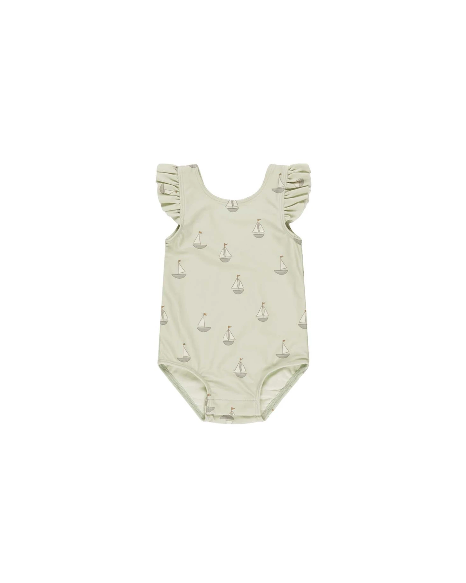 This darling one-piece swimsuit features a scoop neck and back, bottom summary snaps, and fun flutter sleeves.
