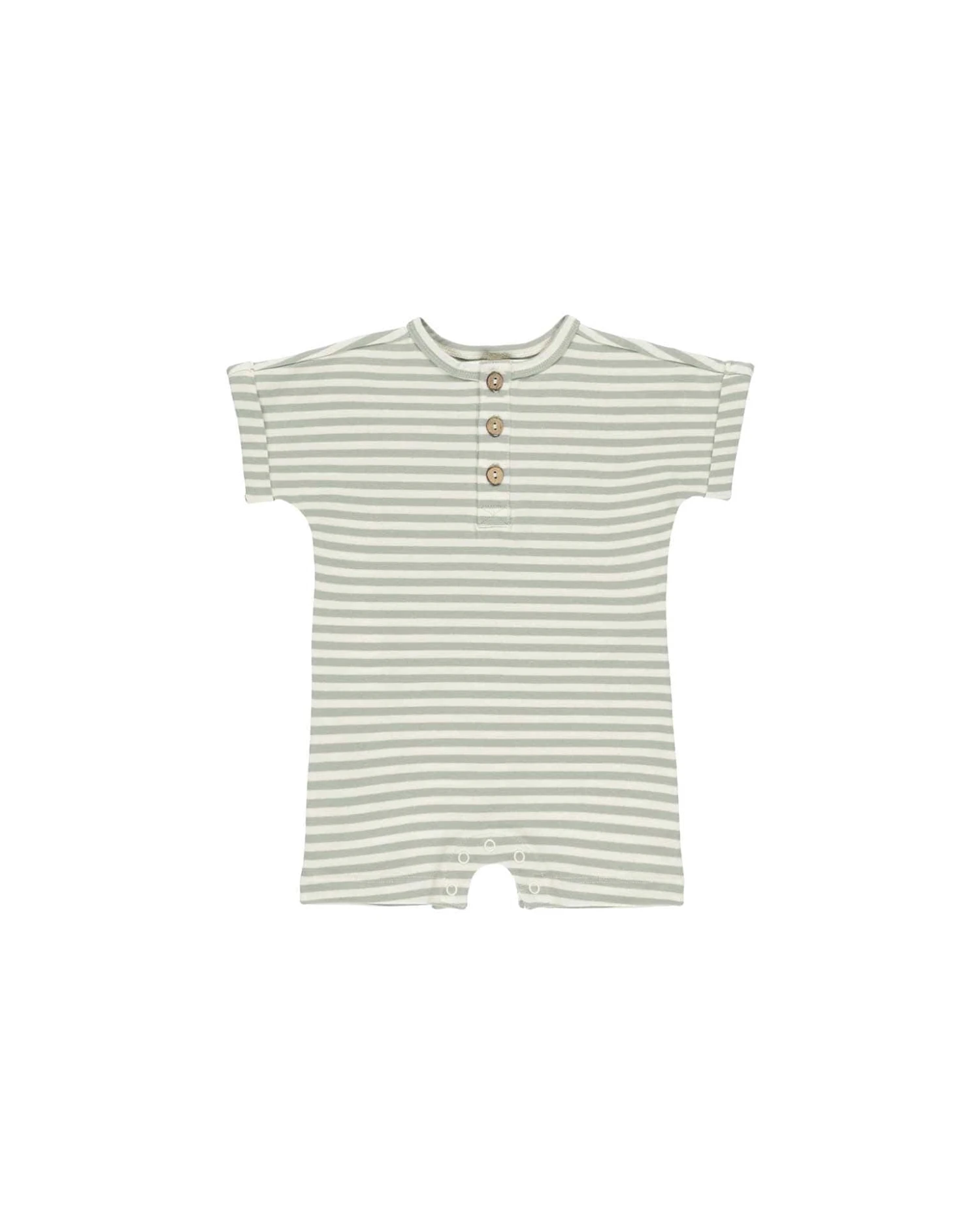 Our short-sleeve romper has folded cuffed sleeves, summarys down the chest, and snaps along inseam for easy changes – the perfect lightweight summer staple!