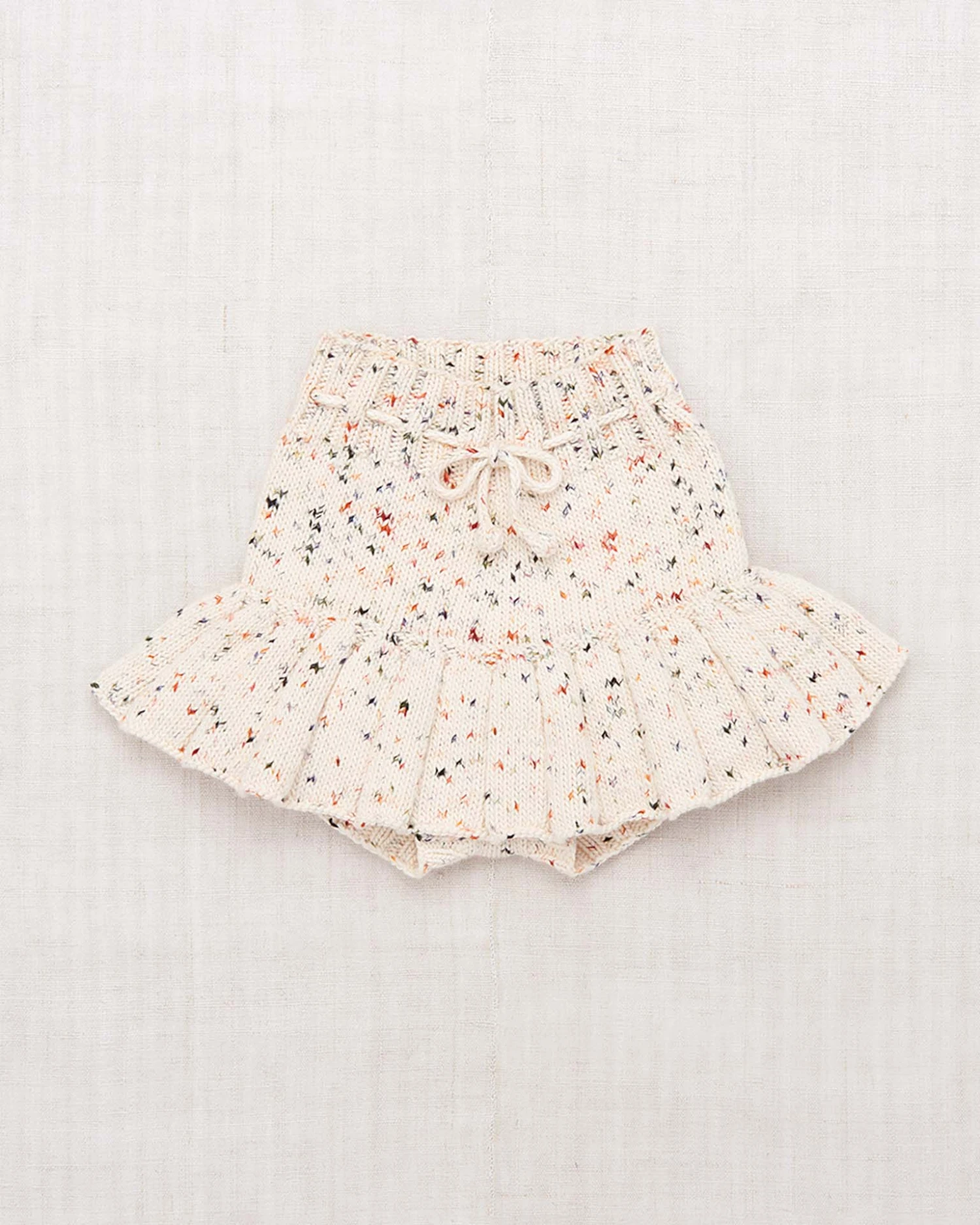 A hand-knit skirt in Pima cotton, featuring attached bloomers with ribbed cuffs and a ribbed waistband with a popcorn tie drawstring for a secure fit. The hand-dyeing process of our yarn introduces beautiful variations and subtle nuances, making each garment truly unique.