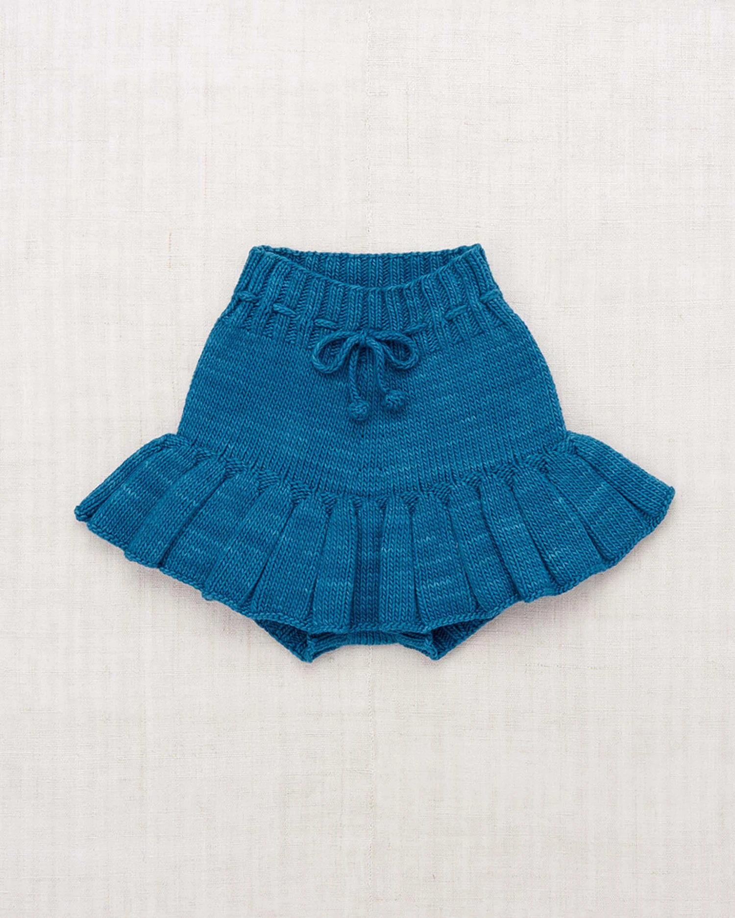 A hand-knit skirt in Pima cotton, featuring attached bloomers with ribbed cuffs and a ribbed waistband with a popcorn tie drawstring for a secure fit. The hand-dyeing process of our yarn introduces beautiful variations and subtle nuances, making each garment truly unique.