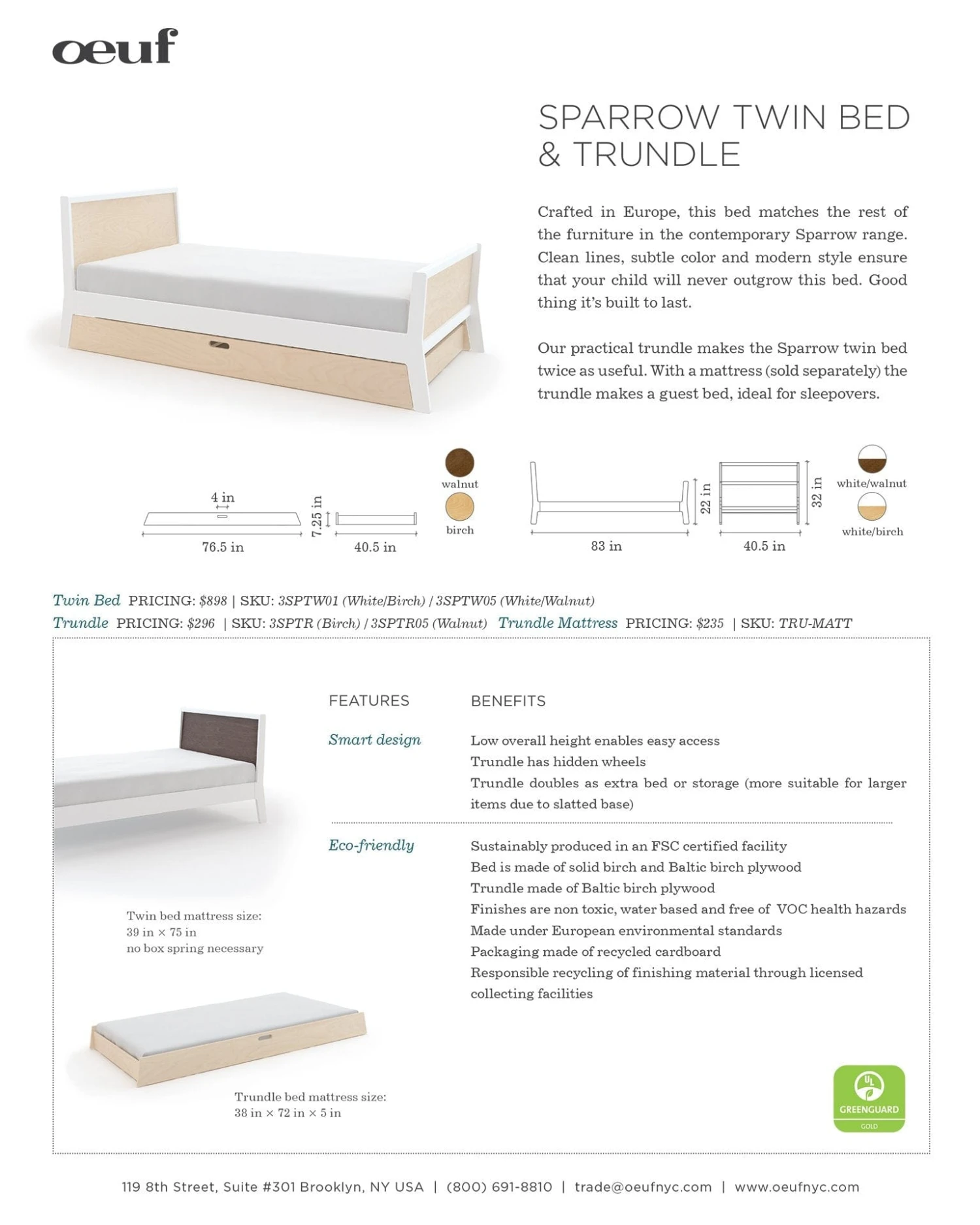 Put every inch to work with this space-saving trundle, designed to slide smoothly under our Sparrow Twin Bed. Part of our iconic Sparrow collection, it shares the same clean lines and sustainable production as the bed above it. The trundle’s flexible space is there when you need it, perfect for sleepovers or storing extra bedding and seasonal clothing. Oeuf trundle beds require our exclusive Trundle Mattress.