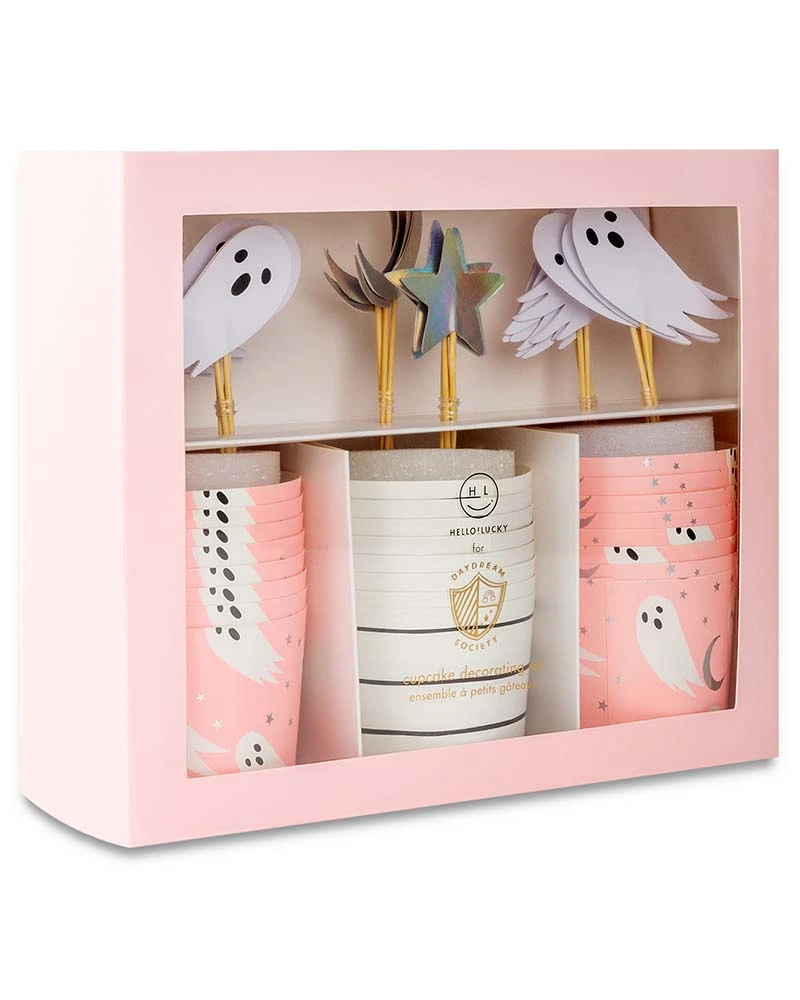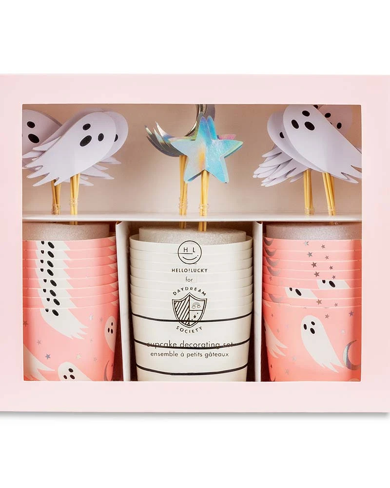 Oh hey, boo! Featuring holographic silver foil and neon coral, this halloween ghost decorating set is sure to make your cupcakes seriously spooky.
