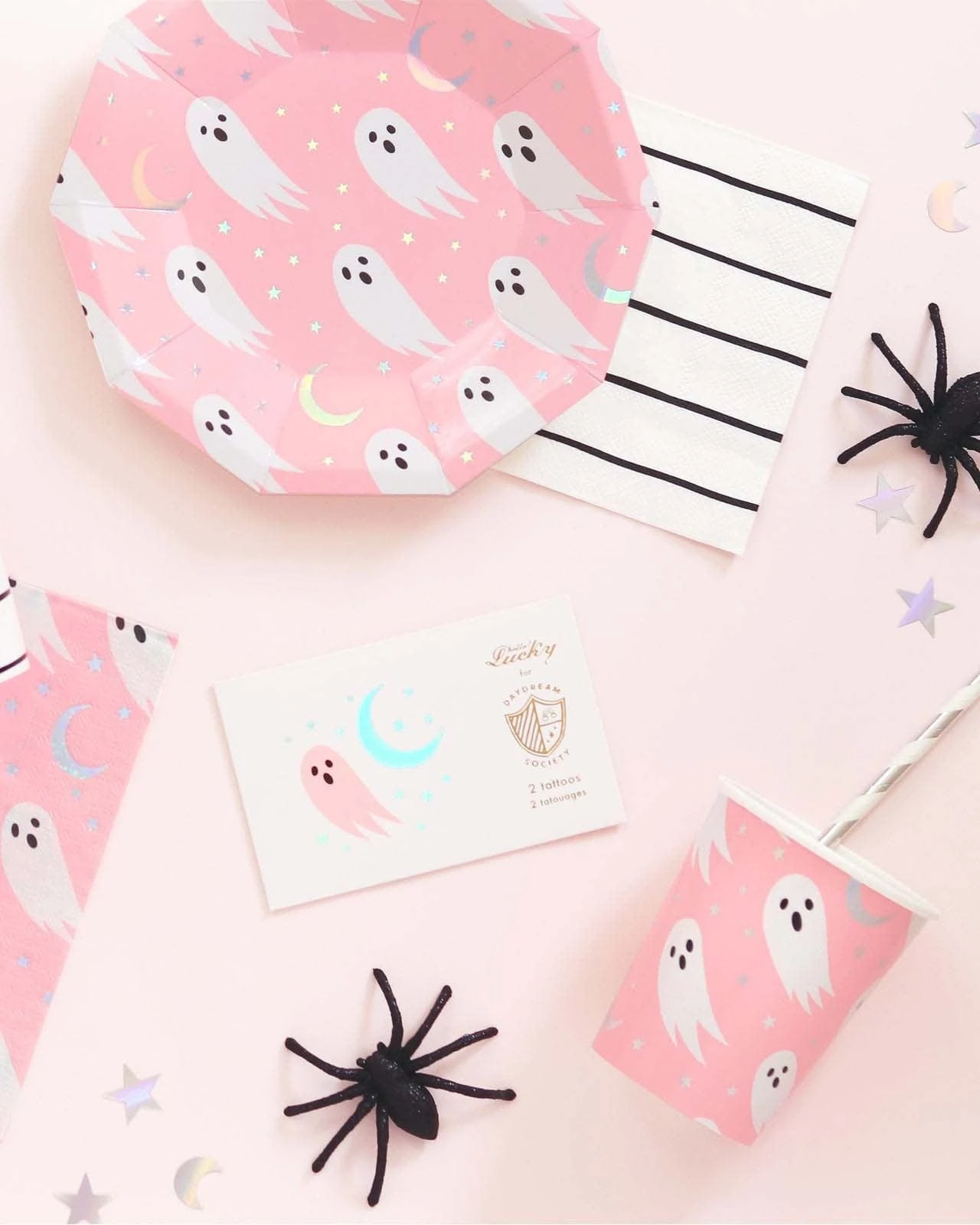 Oh hey, boo! Featuring holographic silver foil and neon coral, these halloween ghost plates are seriously spooky.