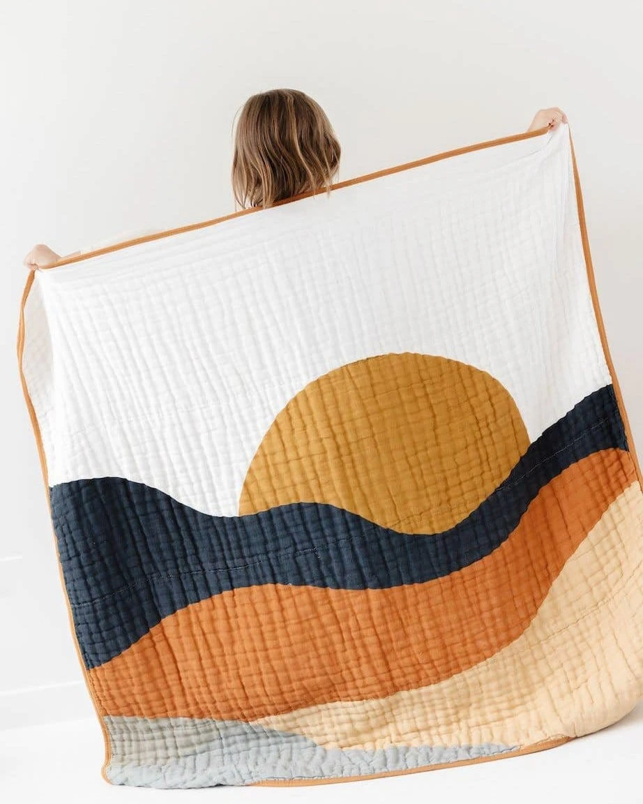 Four layers of muslin come together in this breathable but warm quilt perfect for babies, toddlers, cribs, playtime, picnics and photos. This Sunset Quilt from Clementine Kids features a sun setting over the mountains with a solid rust shade on the reverse.