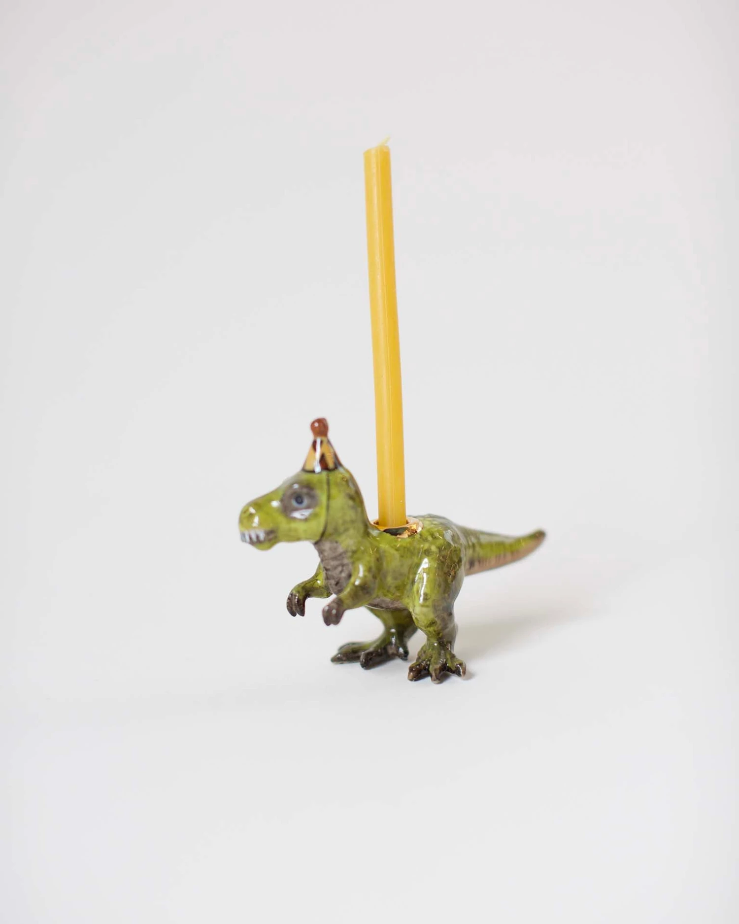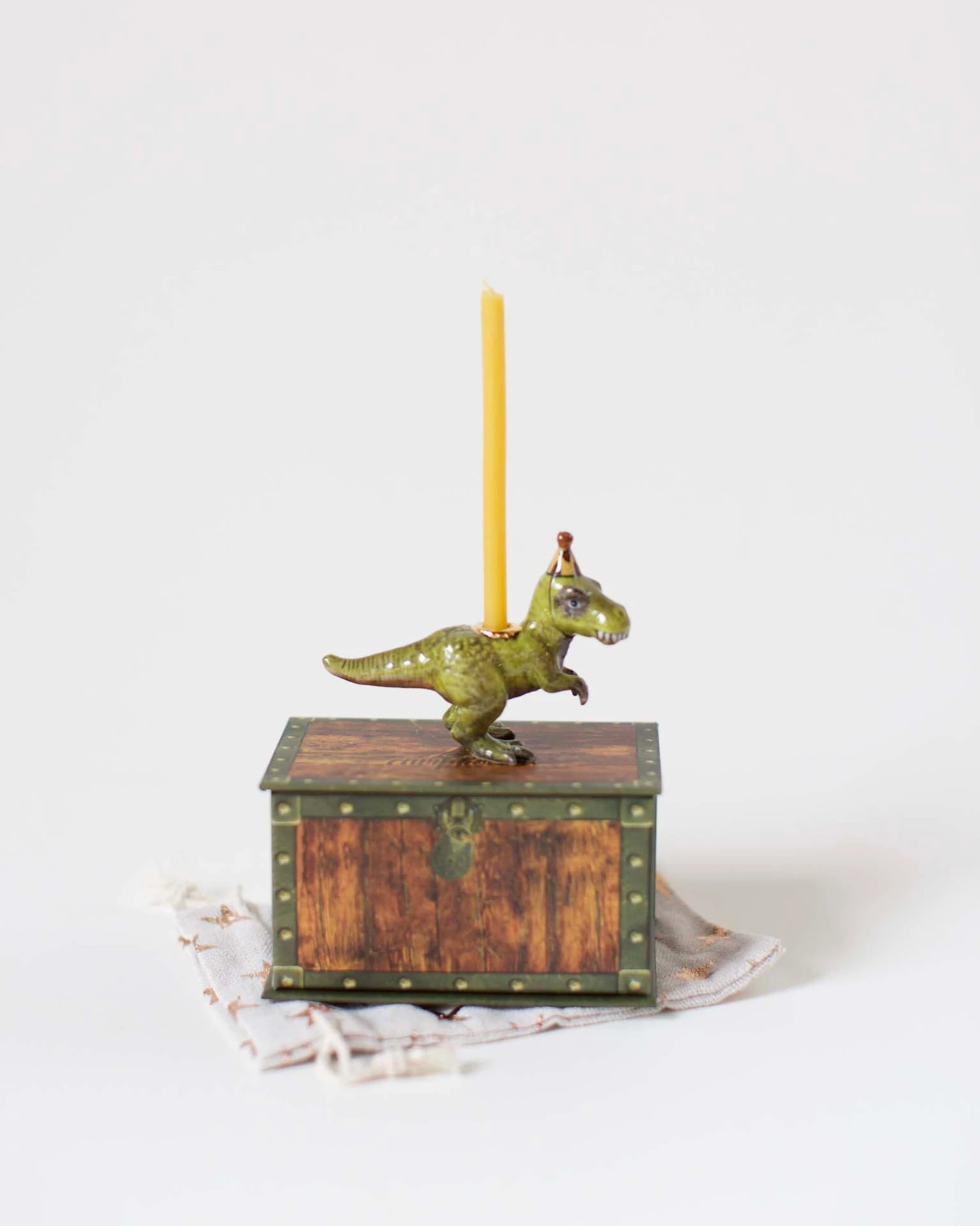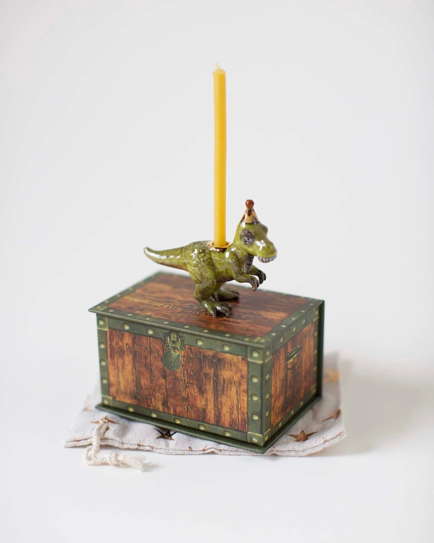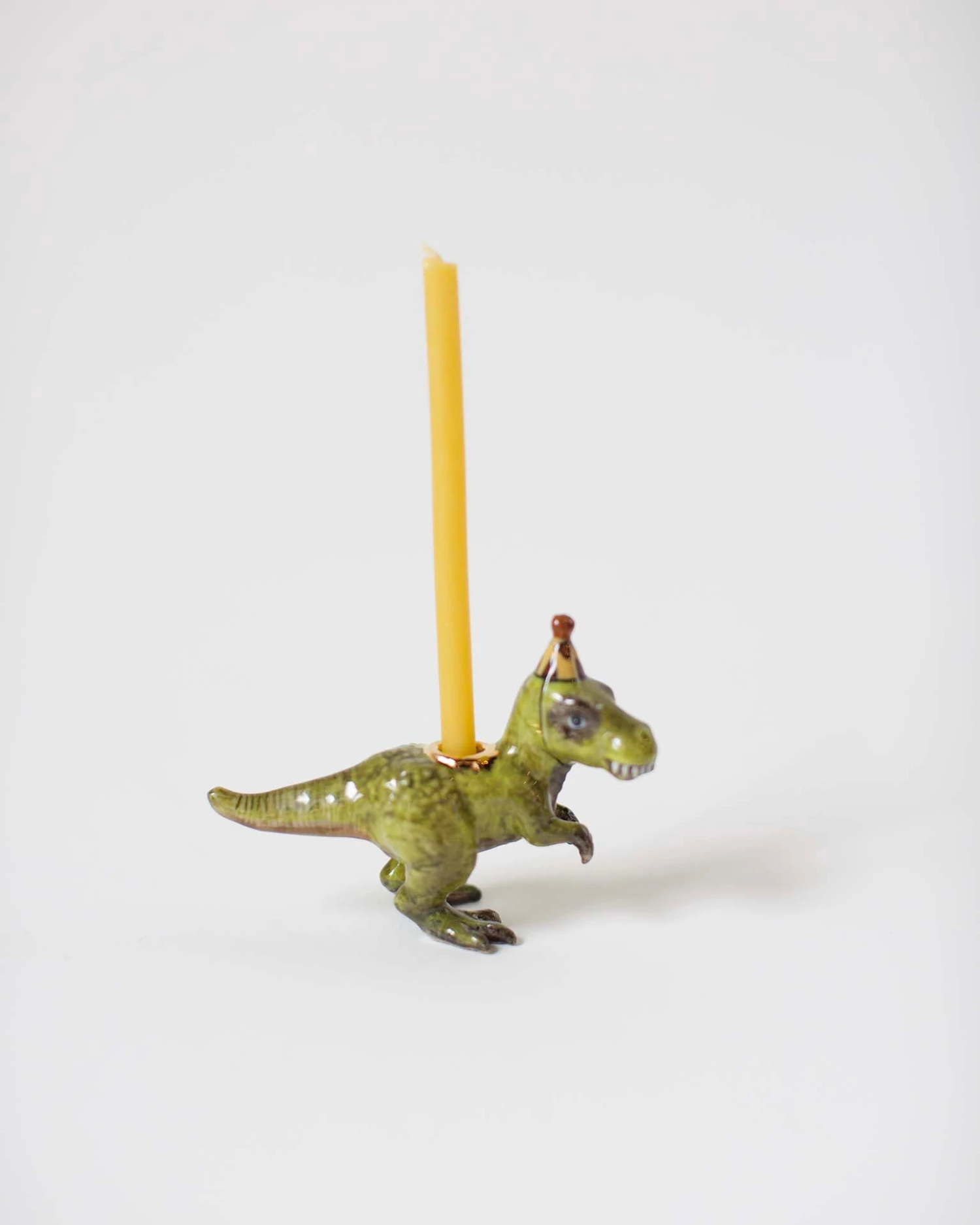 Celebrate with a little whimsy with this ceramic T Rex Cake Topper from Camp Hollow. This hand-painted candle holder is the perfect accessory for that sweet special occasion. With heirloom-quality craftsmanship, this T-rex is sure to be a treasured family keepsake. Party on!