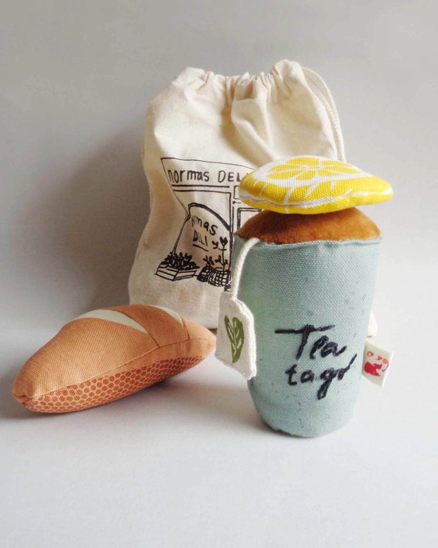 This pretend play tea and French baguette set is perfect for imaginative play. It features a cup of tea with velcro attached lemon slice and a freshly-baked French baguette, both made of sikscreen printed cotton canvas and velvet with embroidered details.