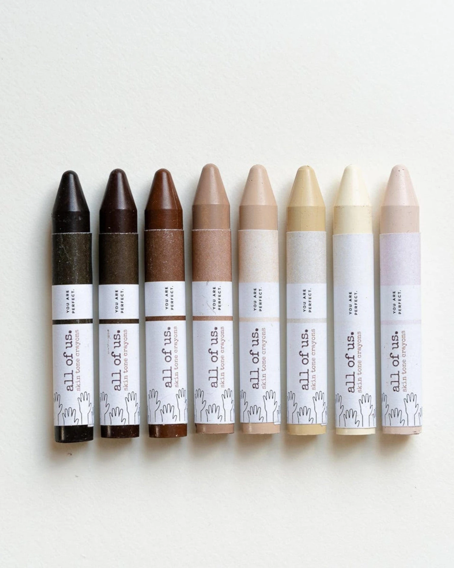 This set of 8 skin tone crayons is richly pigmented to represent and celebrate the beauty of all skin tones. Each crayon is poured by hand to create a thick, round crayon that is easy for little hands to grasp.