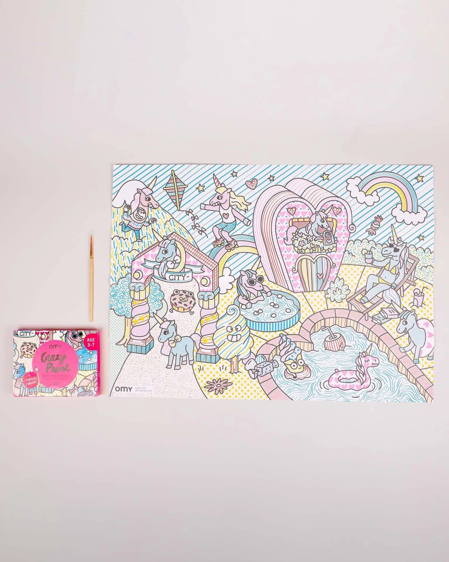 Discover the world with this ready to paint mini poster from Omy. With paint dots already printed on the paper, all you need is water and the brush to create your crazy painting. Perfect for travel or rainy days indoors.