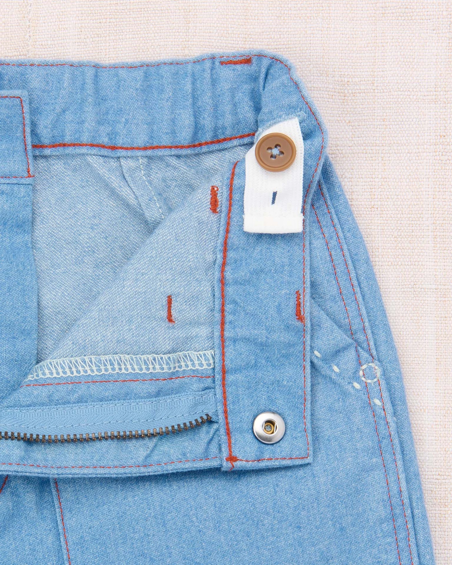 A relaxed tapered-leg jean in 100% cotton denim, featuring four standard pockets, one utility cargo pocket, contrast topstitch detail, and a hidden interior adjustable waistband for the perfect fit. Finished with hand-tacked stitches instead of rivets for softness.