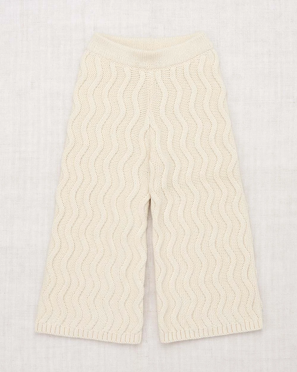 A pull-on wide-leg pant in a heavier-weight Pima cotton knit, with an allover traveling cable, a soft banded elastic waist, and ribbed hem. This piece adds a visual twist with its wavy knit-down — turning an everyday piece into something that feels exciting to throw on.