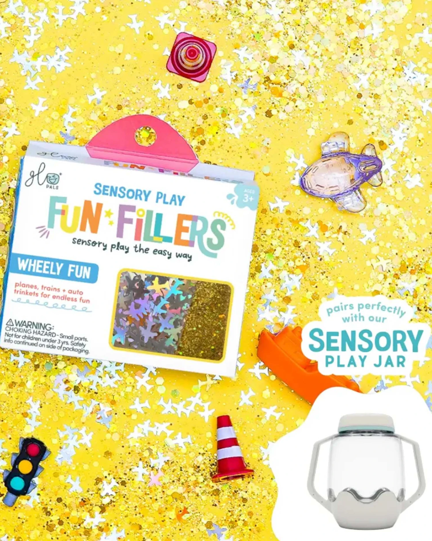 Fun Fillers take the fuss out of curating the perfect sensory play activity! Each pack includes themed sensory accessories that take playtime to the next level! These pair perfectly with our new Sensory Play Jar – or you can use them to enhance your favorite sensory bin. Perfect for water, rice, slime, play-dough and more, Pals!