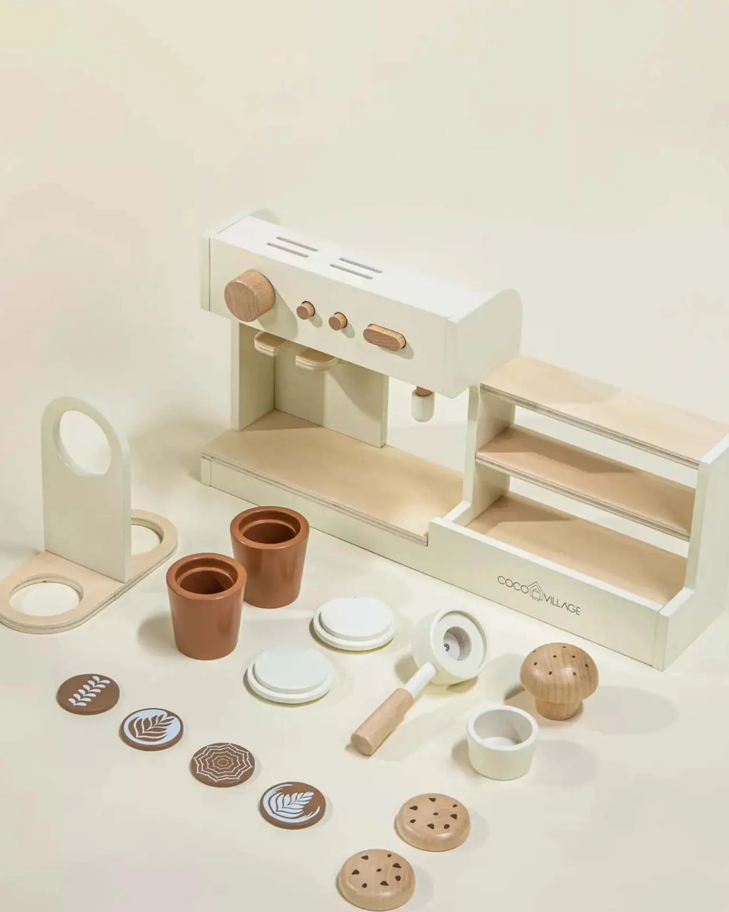 This set includes: 2 wooden coffee cups, 2 wooden coffee cup covers, 1 cup holder for easy transport, 4 decorative latte toppers, 2 cookies, 1 muffin with a removable wooden muffin cup, 1 movable filter to imitate a real coffee machine