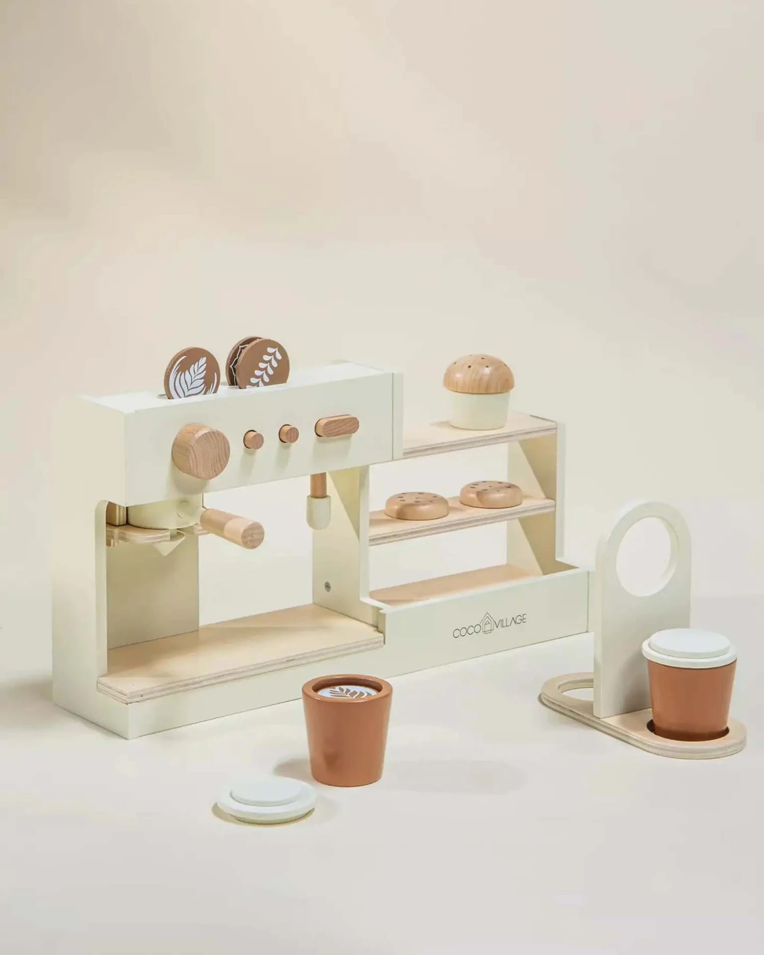 Brew up some fun with the Wooden Coffee Shop Playset! Let your little baristas take orders, whip up imaginary lattes, and serve pretend pastries. This playset is perfect for sparking creativity and social play. Watch as they create the cutest coffee shop in town, filled with endless giggles, realistic looking lattes and delicious imaginary treats.