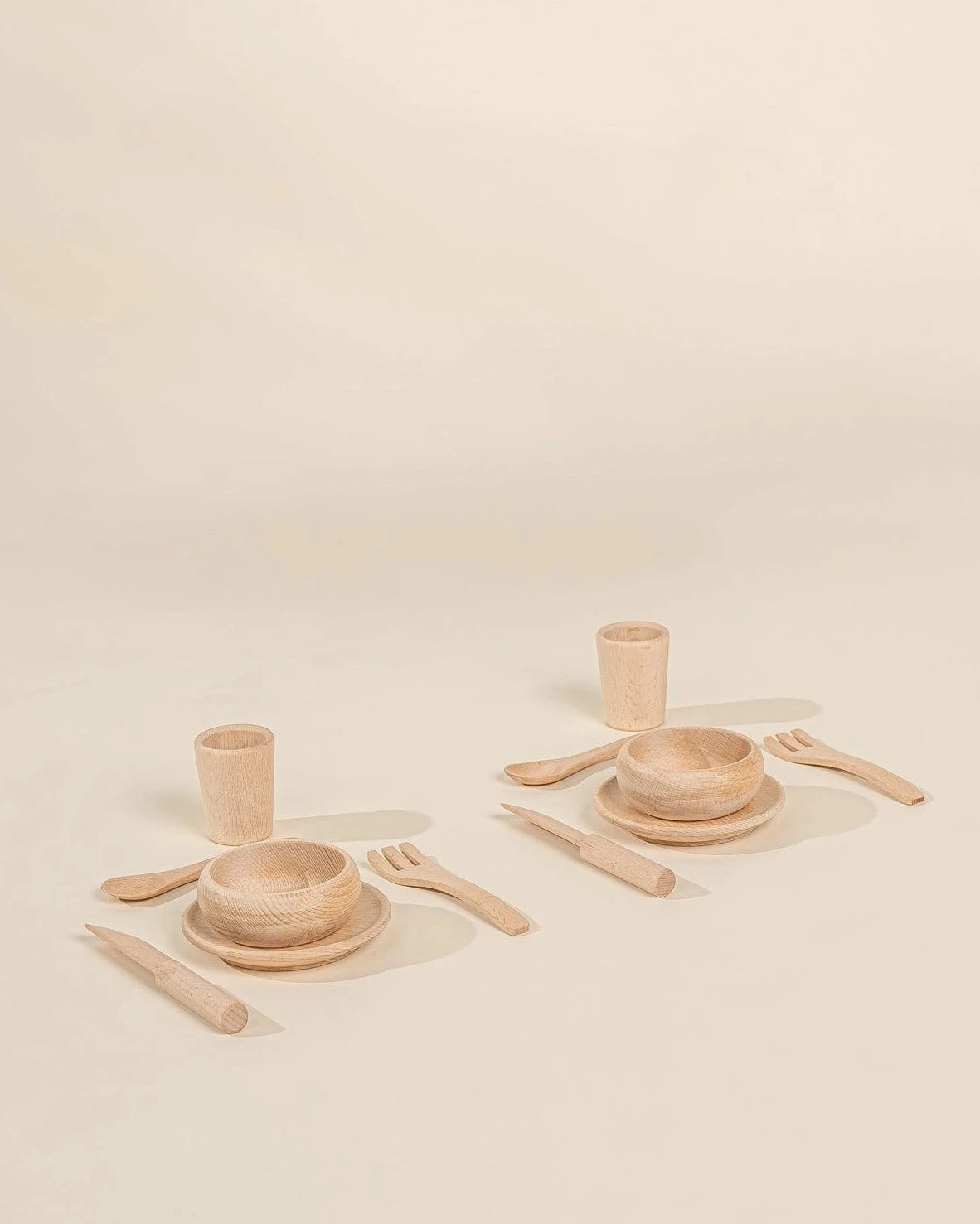 Coco Village’s set of wooden cutlery includes 2 plates, 2 bowls, 2 glasses, 2 forks, 2 knives and 2 spoons. Everything you need to serve the most delicious meals cooked directly in the imagination of your little ones. A set of small cutlery can encourage children to eat independently and familiarize themselves with these everyday tools.