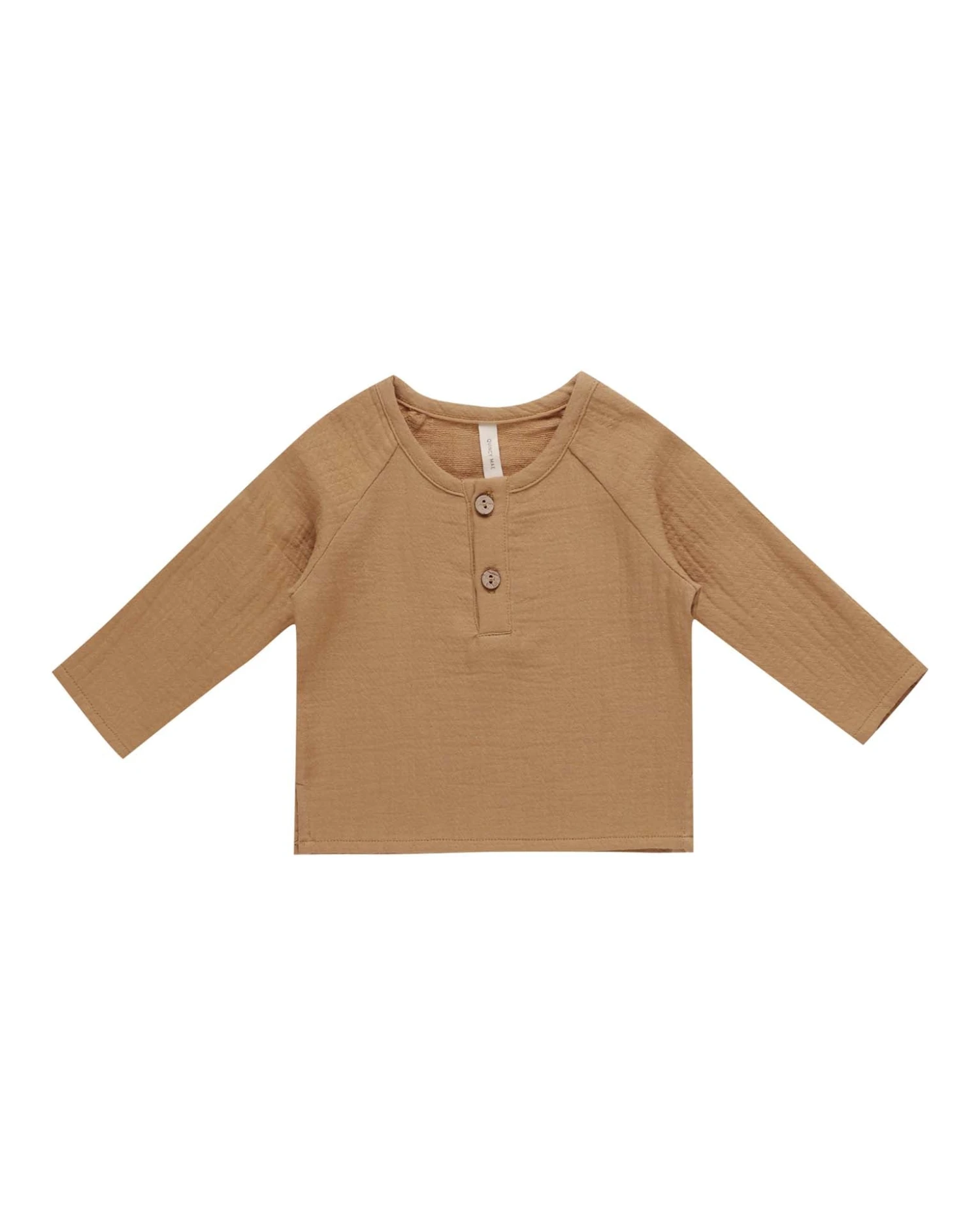 This long sleeve boxy-fit gauze shirt with summary front closure pairs perfectly with the Quincy Mae woven pants.